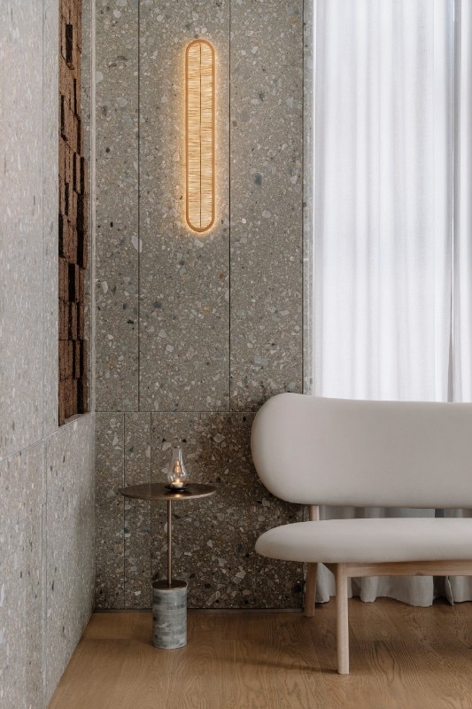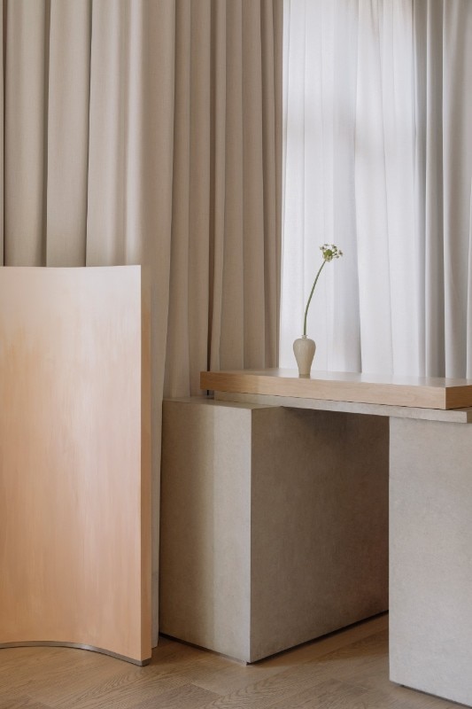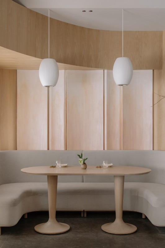 The collaboration with florist and designer Maggie Mao ensures that even the few decorative elements evoke calm and tranquility: small vases with a single stem inside are a clear reference to the art of ikebana.