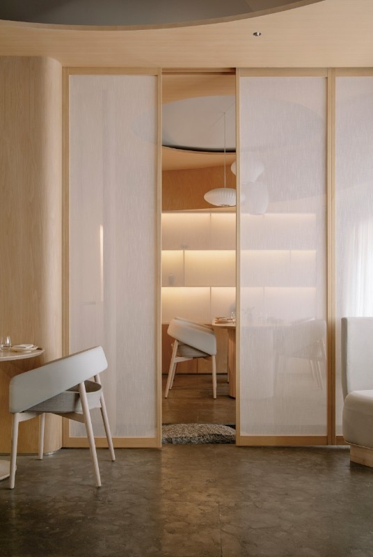 Lunar, a restaurant serving contemporary Chinese cuisine, is spread over two floors. Matte tones and soft colors alternate at the entrance, where a monolithic reception plays with volumes: elliptical shapes and simple geometries flank each other, creating a balanced environment. This is also where the lounge area is located, a small alcove with Danish furnishings by MatzForm: a room dedicated to the tea ritual that provides a multi-sensory experience. The bricks created with pressed tea leaves and embedded in the terrazzo walls, together with marble, wood and the soft textures of the bamboo curtains, are a perfect fusion of Scandinavian design and traditional Chinese gardens.