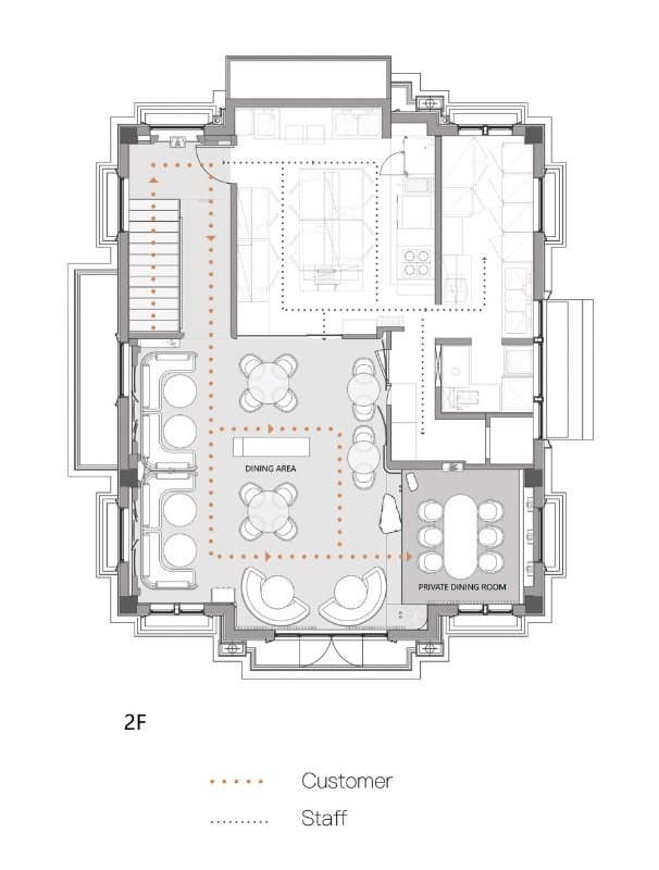 The attention to detail emerges especially on the second floor, in the dining room. Here, layers of transparency and opaque tones reveal the studio's intent to create a zen-like atmosphere. A trickle of water carved into the floor and a semi-transparent partition separate the communal dining room from the private one. The few rough rocks arranged in the rooms reflect the organic essence of the place. At the tables, ceiling lamps recall Chinese paper lanterns, while hand-painted wood panels in orange hues evoke the pallor of a moonlit night.