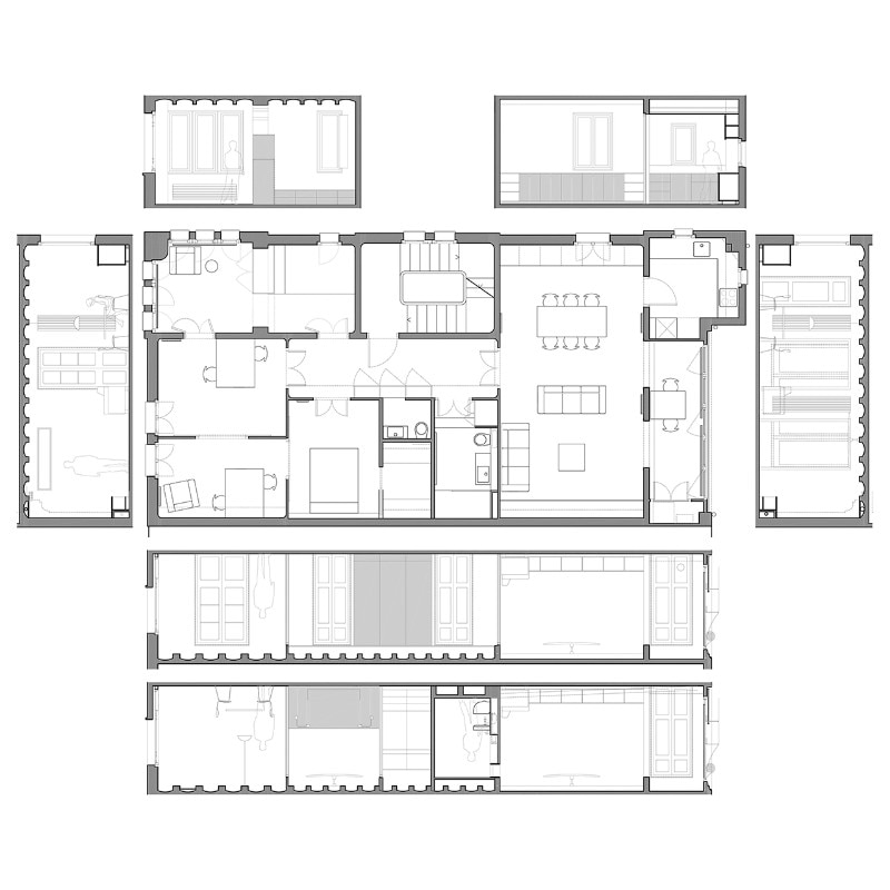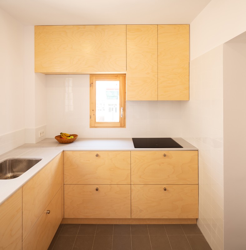 All the new furniture elements are made of exposed wood (birch plywood for the custom-made furniture and pine wood for the windows). The existing woodwork (interior and exterior) has been painted white, allowing a clear distinction between new and existing.