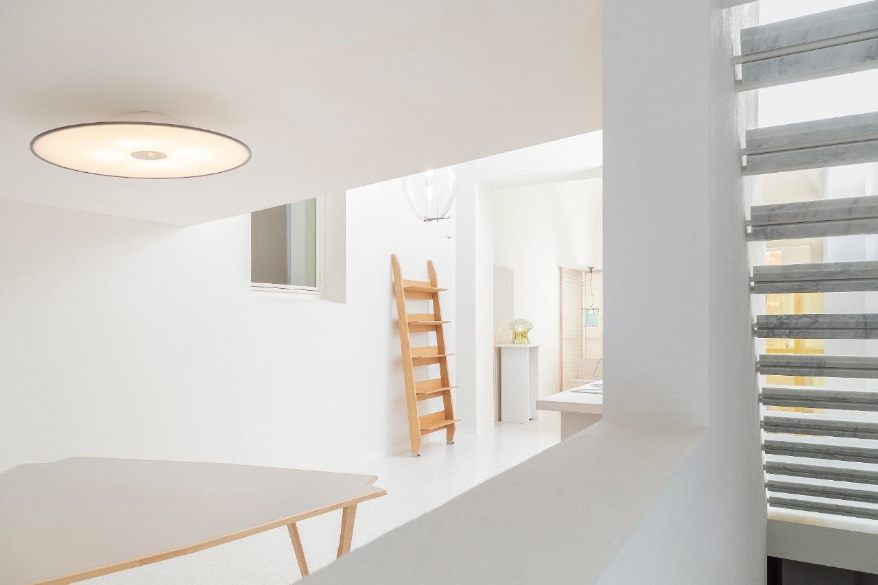 By combining Carrara marble terrazzo flooring with enamels and lime plasters with a variable alchemy, Riva made use of light to multiply the shades of white, in a space that is simple yet never banal, given the skilful insertion of clefts, diagonals and slight variations of sections.