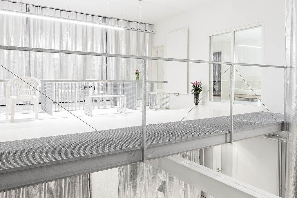 The need to enhance the perception of brightness has also guided the choice of materials for the upholstery and custom-made furniture, which veered toward a total-look declined in silver and metal tones. Large silver curtains made of aluminum vapor barriers are placed in front of the kitchen and all service spaces, so as to protect working moments by immersing them into an abstract, almost timeless space. The combined effect of the galvanized furniture and the curtains, a kind of monochrome non-color that dilates the environment by enhancing reflections, merges with the white walls and concrete floor of the basement, delineating an aseptic place that nonetheless finds a note of pleasantness and glamor of its own, thanks to unique light effects.