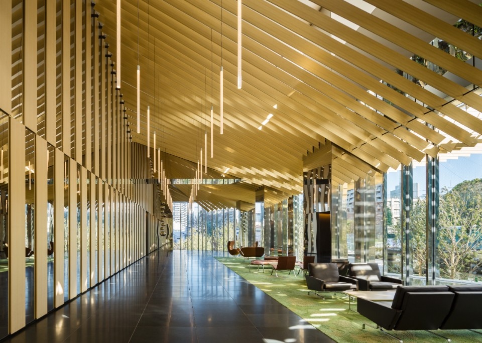 The building interprets the suggestion that comes from the name of the context in which it is located: hinoki-cho means “cypress grove”, which revives the idea of architecture as a tree in the heart of the city. The tower sits on an artificial hill, which serves as the base of the tree; the roots are composed of eaves and a pool that merge the building into the ground; the trunk – the elevation – is clad in aluminium panels with hinoki bark; the crown features a green canopy from which a spectacular view of the urban skyline is projected.