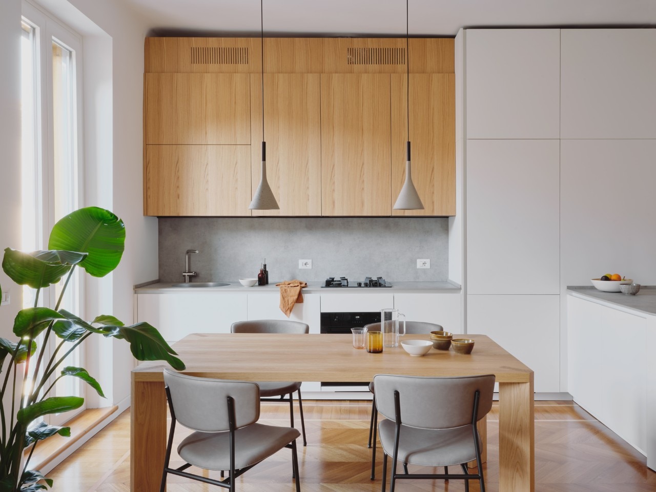 The entrance leads to the living area through a double hinged door: a single room that connects the living room, kitchen and dining room, this space has original herringbone oak parquet flooring, renovated and completed in some parts. In the flat, the architectural choices have always been made with respect for the pre-existing elements, which in fact dialogue with the new elements. At the same time, the presence of fixed furniture designed exclusively for this location allows maximum use of space.