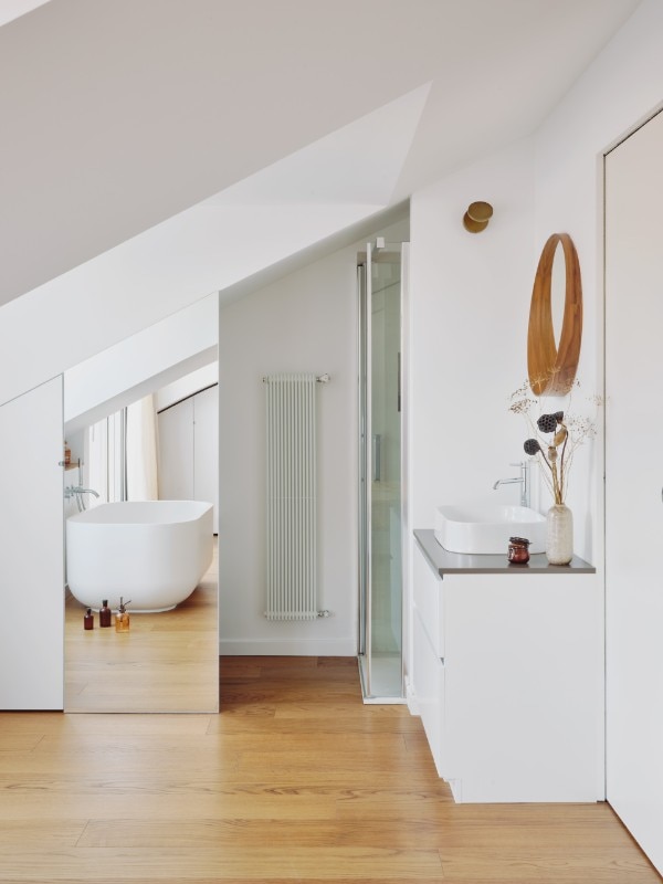 Here, the demolition and construction of a new roof, and the introduction of two large sliding openings, have transformed the space by infusing it with natural light. An open space in which bed, bath and personal hygiene space merge.