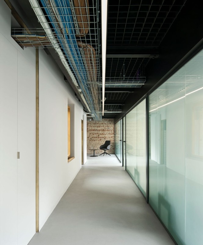 The chosen mood, as explained by the designers, is a neutral, almost cold atmosphere, allowing the brick walls, steeped in history, to speak to future users of this shared office.