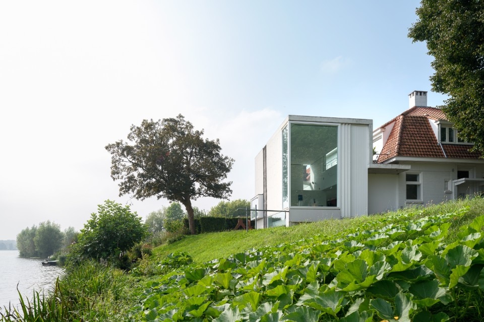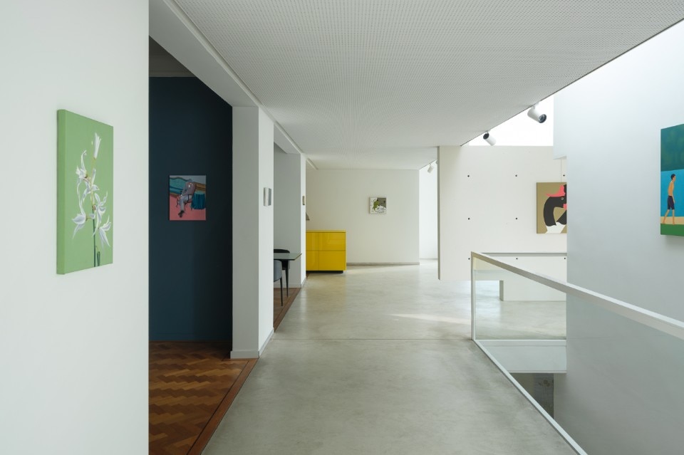 The white brick building, dating back to the 1920s, was developed as a dwelling according to a rigorous layout: a central corridor clearly dividing the communal and private spaces. In 2000, the ethereal white-concrete cube – designed by Thomas Kemme Architects and annexed to the existing building – with large windows blurring the boundary between interior and exterior, consecrated the transformation of the dwelling into an art gallery by offering a new room flooded with natural light.