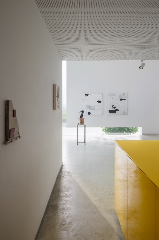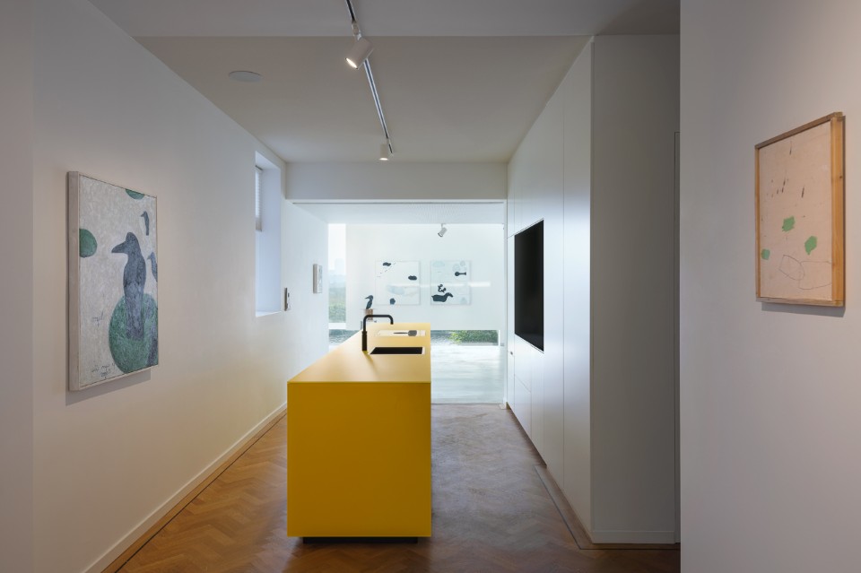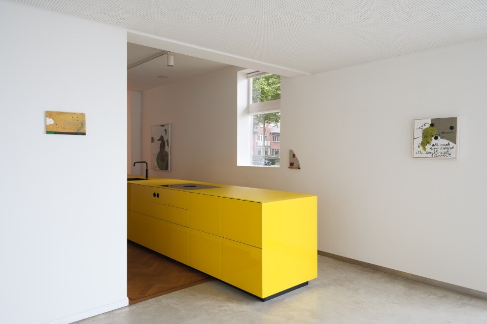 The new monolithic kitchen block, bright yellow in colour, recalls the residential spirit of the building and contaminates it with a gritty and vaguely pop touch, boldly standing out among the immaculate wrappings, as if to declare art's intolerance of any conceptual separation and boundary between living and exhibiting.