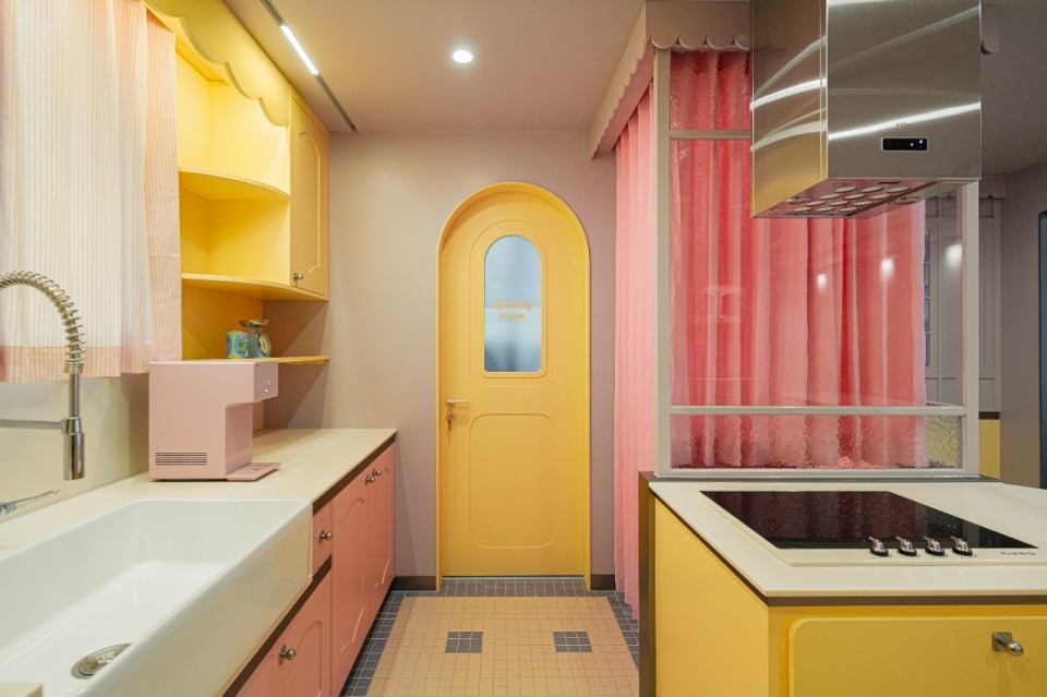 The imagery recalls and brings together the disturbing set designs of Squid Game with the candy-pink and vanilla-yellow universe of a dollhouse.