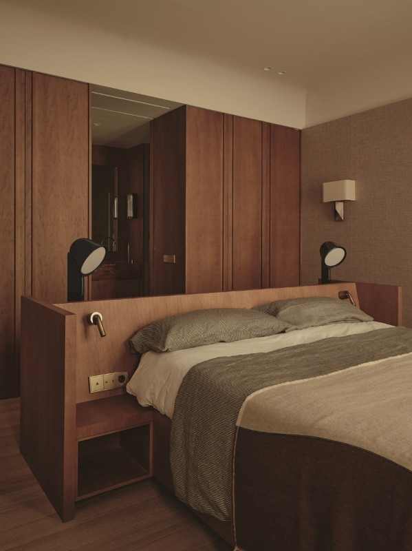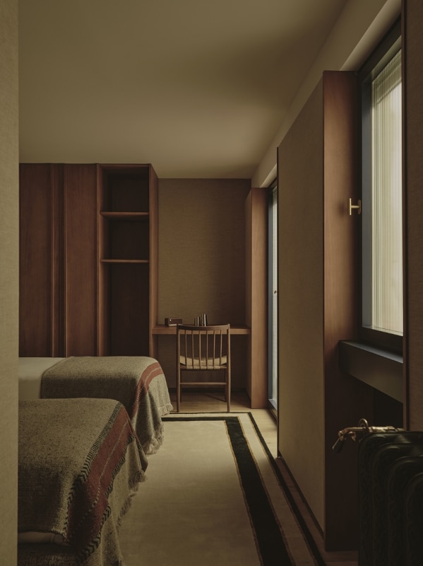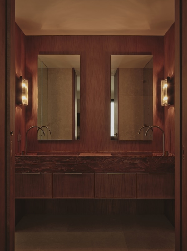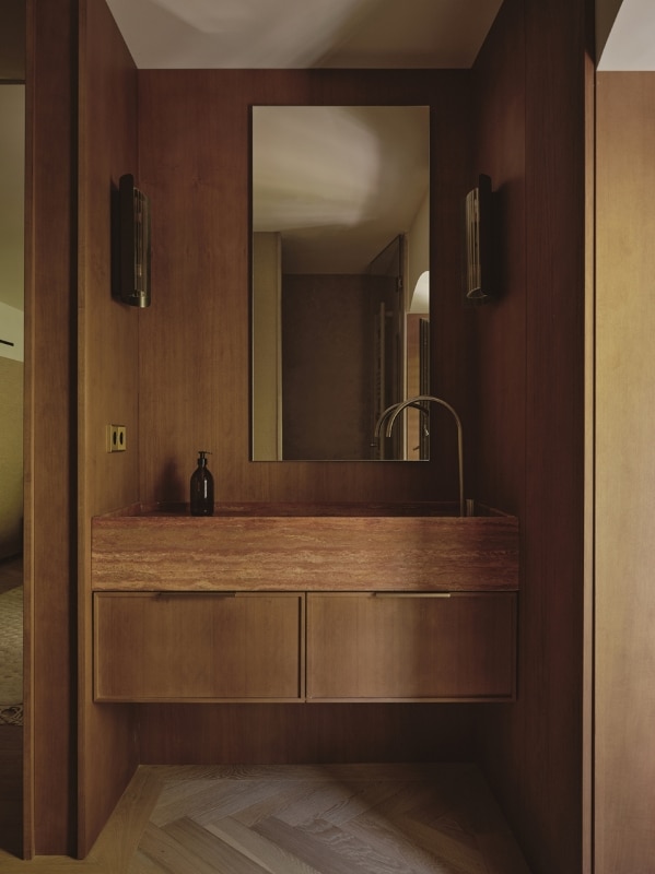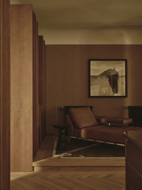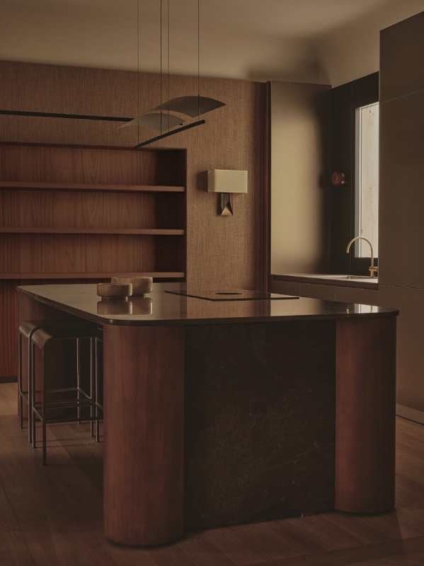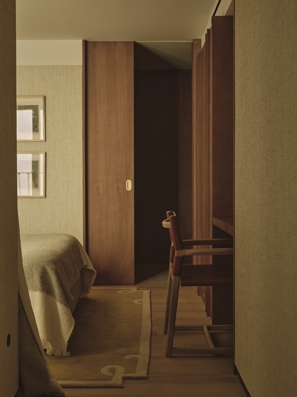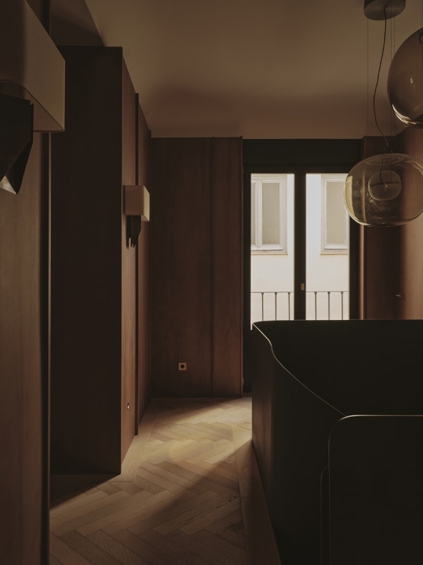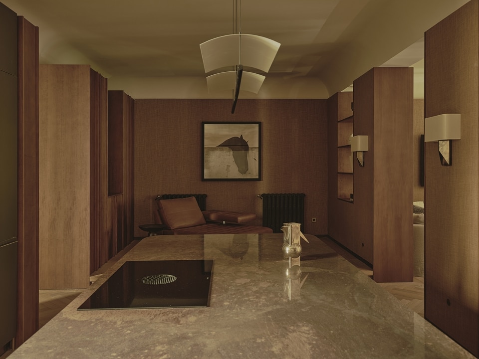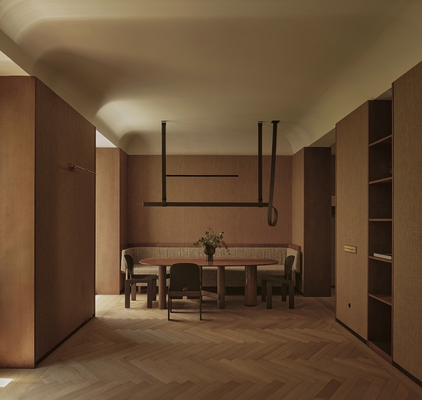 The living areas function as autonomous yet deeply interconnected spaces, made permeable by openings reminiscent of theatrical wings; bespoke wood paneling and furniture, interspersed with fabric surfaces, engage the viewer’s eye and invite a playful visual digression.