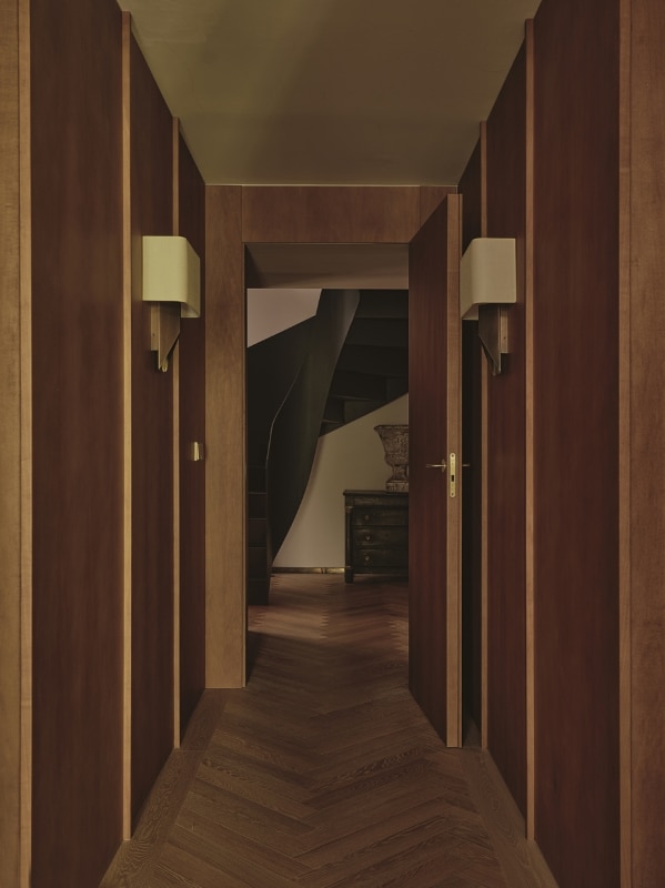The living areas are arranged on the ground floor; living, dining room and kitchen in particular are conceived as autonomous but strongly connected spaces, made permeable by openings similar to stage wings. Indeed, the walls are almost entirely covered with custom-designed wood paneling and furniture, punctually interrupted where portals between rooms create views and passages. The presence of fabric paneling alternating with the wooden furniture stimulates the observer's gaze, suggesting a continuous change of materials albeit in the same color range as the oak, thus creating a playful visual digression, as well as defining the meeting point between the walls and the attachment of the ceiling vaults.