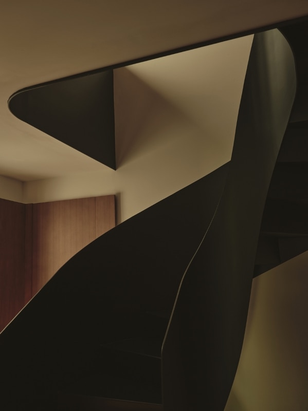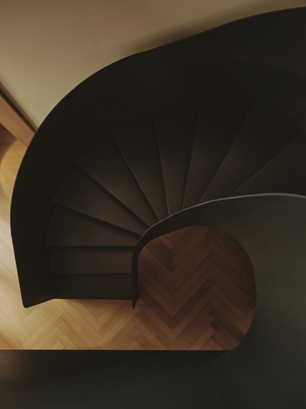 To amplify the concatenation between the rooms is the large spiral metal staircase, which turns out to be the true core of the house, attracting with centripetal force all spatial flows, while a key role is played by lighting design.