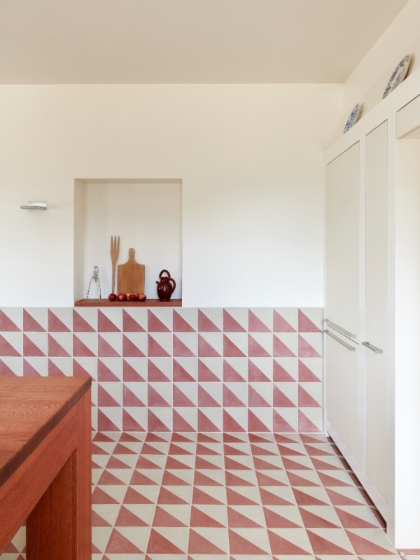 In the kitchen, the heart of the villa, the warm, textured atmosphere of the Languedoc hearth is recontextualised by the geometric patterns of the ceramic wall and floor coverings, the solid wooden table and the decorated plates made from clay from the estate.