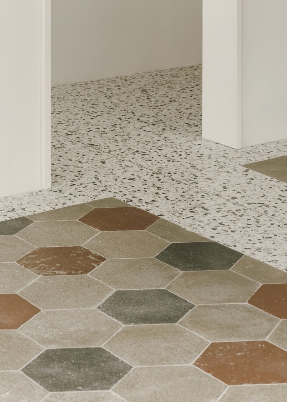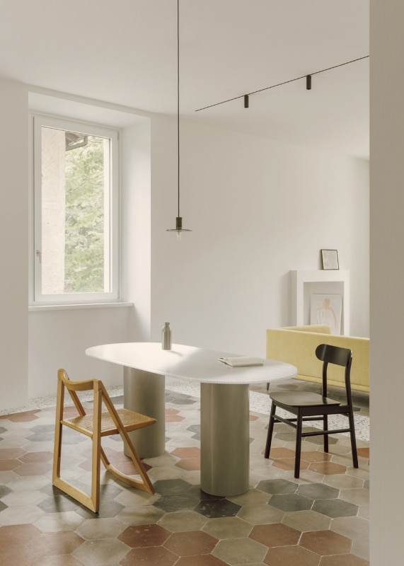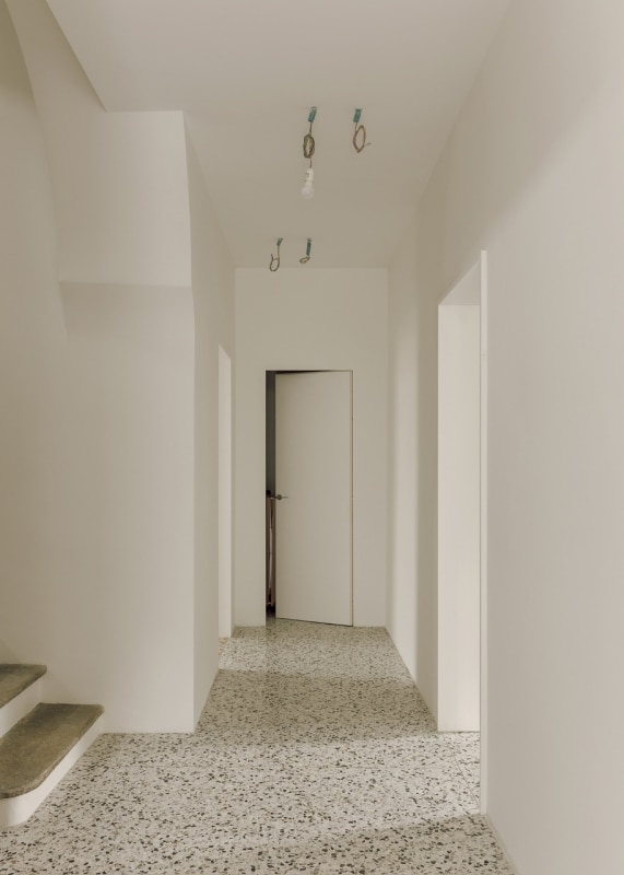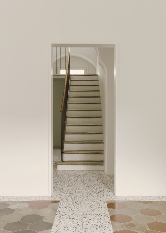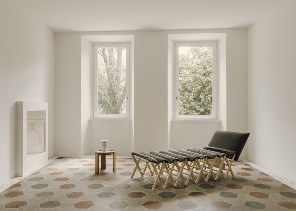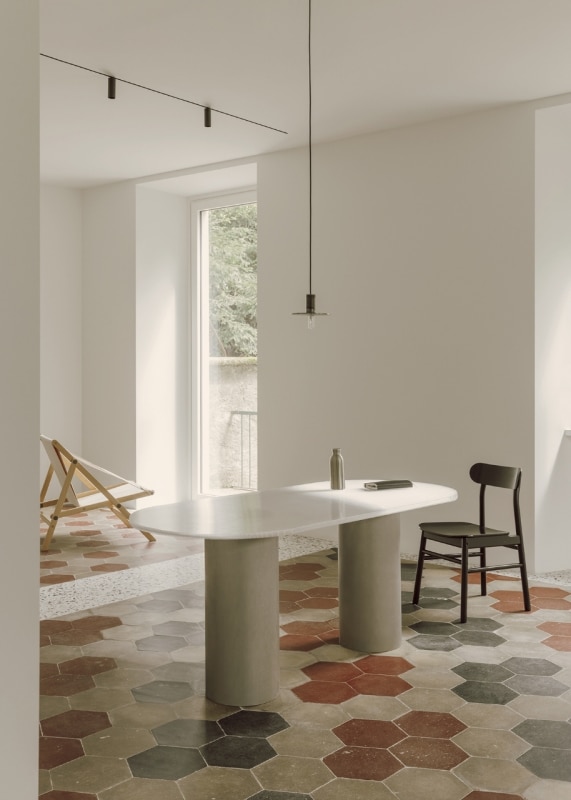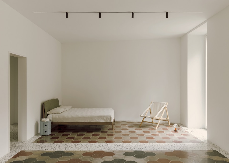 The sophisticated floor treatment on the ground floor repurposes the traditional hexagonal cement tiles, now restored and reconfigured in the form of three carpets (exactly coinciding with the three spaces of the living area) set in a new mantle of grit flooring.