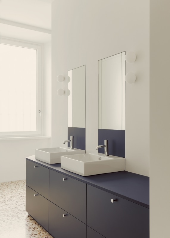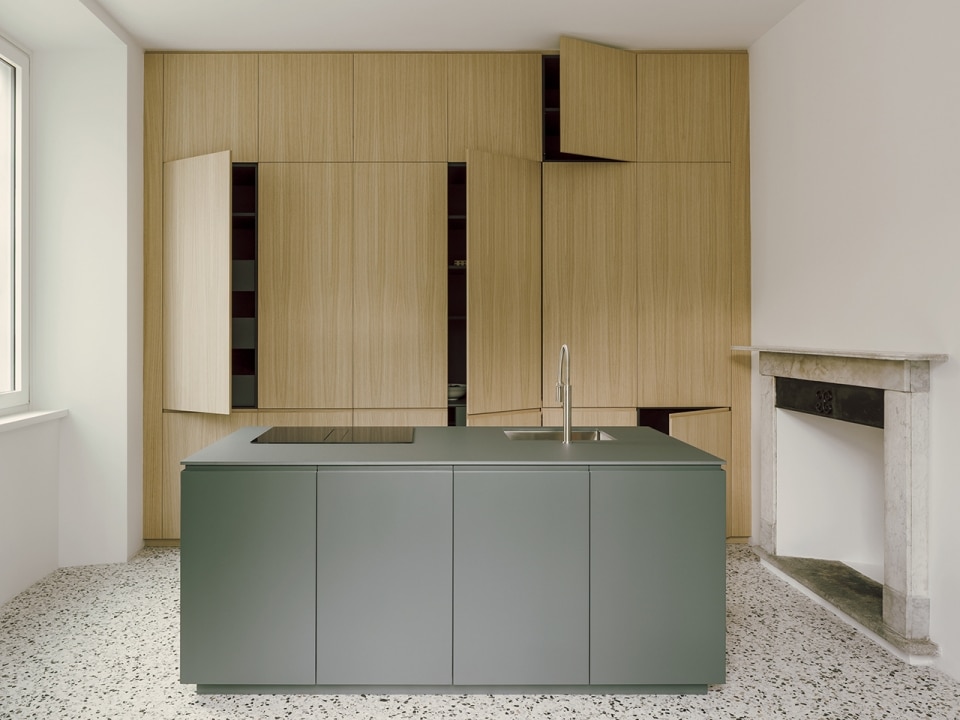 The large bathroom is organized in short, intimate spatial sequences, while the kitchen is minimalist: a central island and behind it a custom-designed pantry wall.