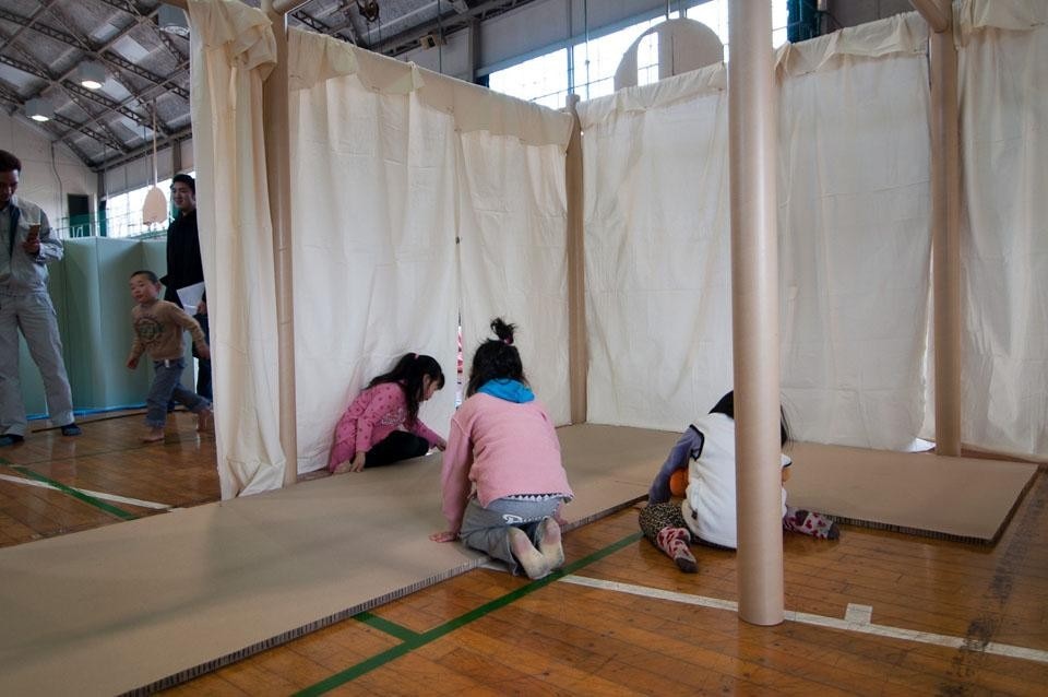 In Fukuoka, in 2005, I created a very simple and low cost partition system for the first time. Fukuoka was hit ten years after the Kobe earthquake, and for the first time in a long time, an earthquake hit Japan with an intensity greater than magnitude 6.0 on the Richter scale. We created simple cardboard partition systems that would help define the "territory "between families but which also serve as isolation systems: at night they were used to help people gain some privacy.