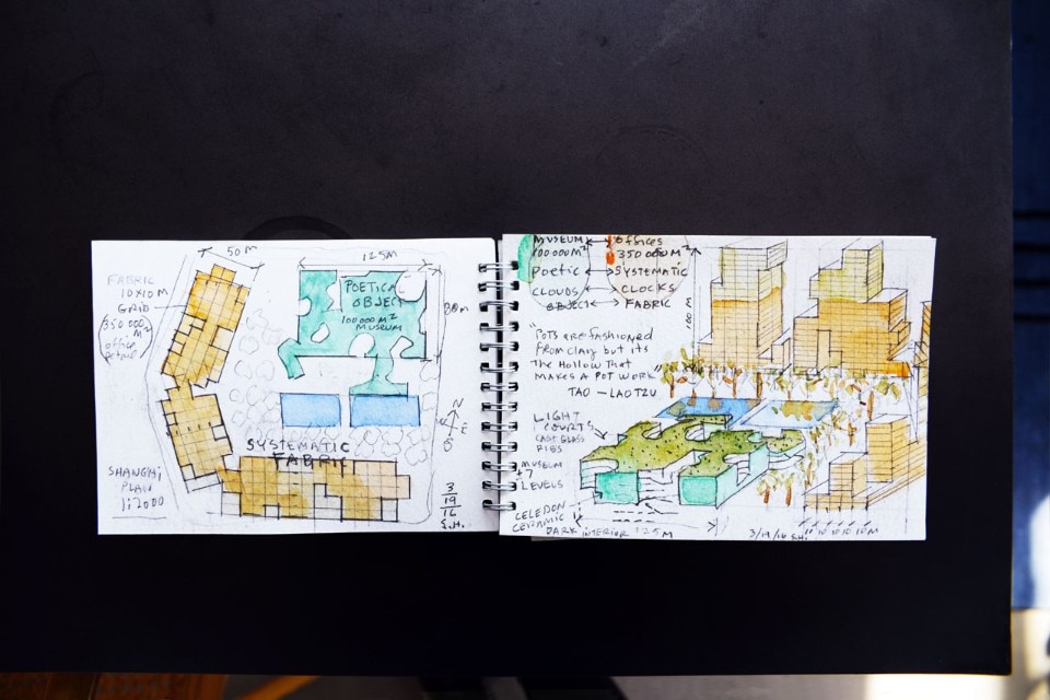 For example, this drawing is about a project competition for the New Shanghai Museum in China; it was made in the Hut but my mind was on the problems of Shanghai. This project idea arises from the dialectic between the poetic and the systematic. I thought of an old lecture by Karl Popper called “Of Clouds and Clocks”: the clouds are the poetic object and the clocks are everything systematic and pragmatic, corresponding with the systematic grid office. Ten people worked on 16 boards and three models for this competition, but everything started here, on these two sheets of paper.