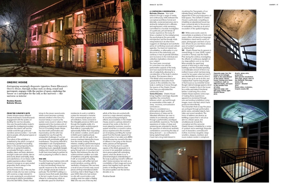 Similarly in the Oneiric House, artist Sonia Khurana enters an old building, slated for demolition, and reinterprets the built space. We then review three of the five-episode long exhibition celebrating fifty years of Chemould Art Gallery’s existence in Mumbai and literally the journey of contemporary art in India. Lastly, we examine how a recent campus by Delhi-based Raj Rewal Associates develops a language of symbols and images that add a probably unintended appeal to the labyrinth of its spaces.