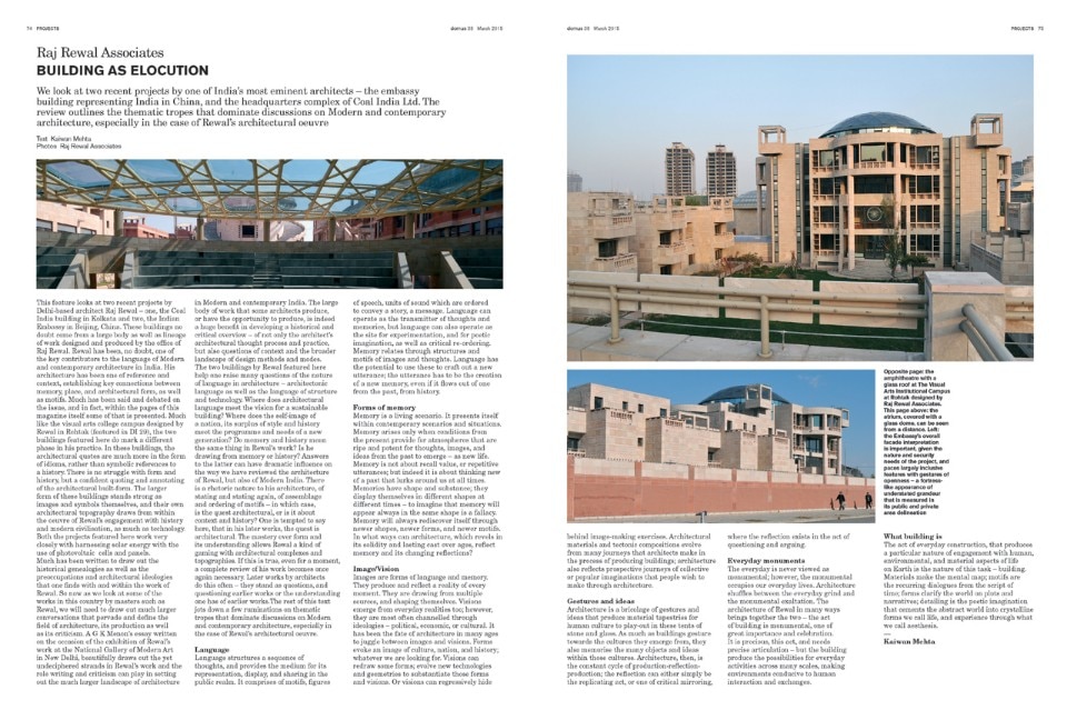 A G K Menon’s curatorial essay for the exhibition Raj Rewal: Memory, Metaphor and Meaning in his Constructed Landscape at the National Gallery of Modern Art, New Delhi takes advantage of the occasion to raise many questions on writing criticism and history of architecture in India, as well as the perspectives that have largely driven our views on, and approaches towards reading contemporary or Modern architecture in India. In that sense, the occasion of an exhibition, or the book does precisely this – open up Pandora’s box – instigate and churn-up questions that will feed new fuel and energy into the profession, the practice, and its larger scope in human and intellectual life.