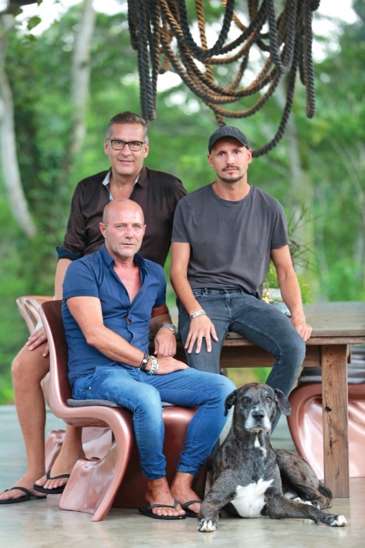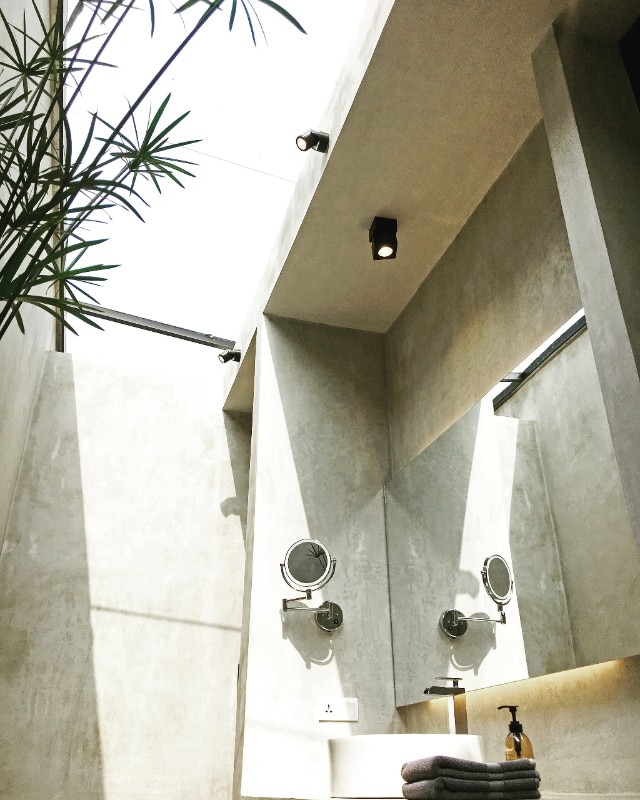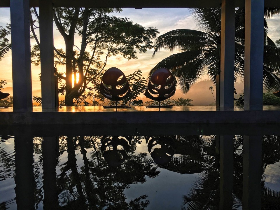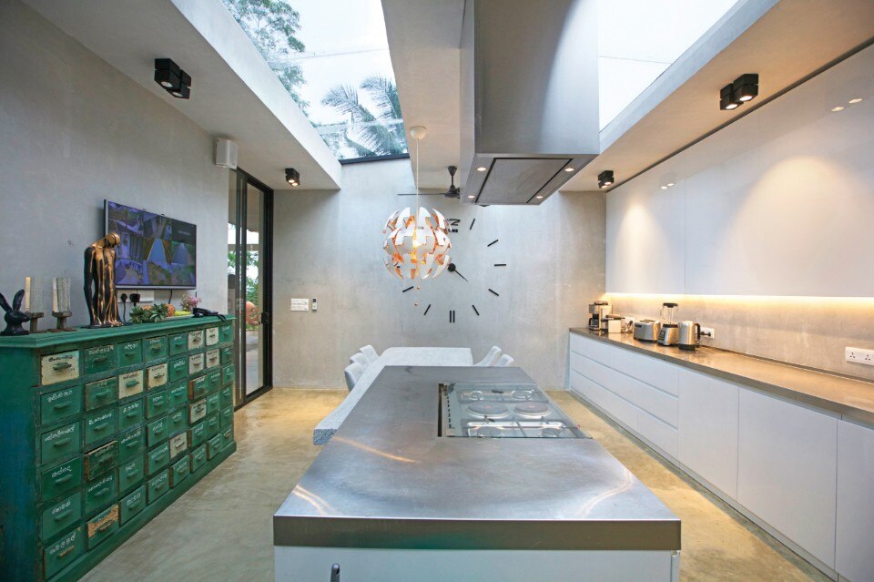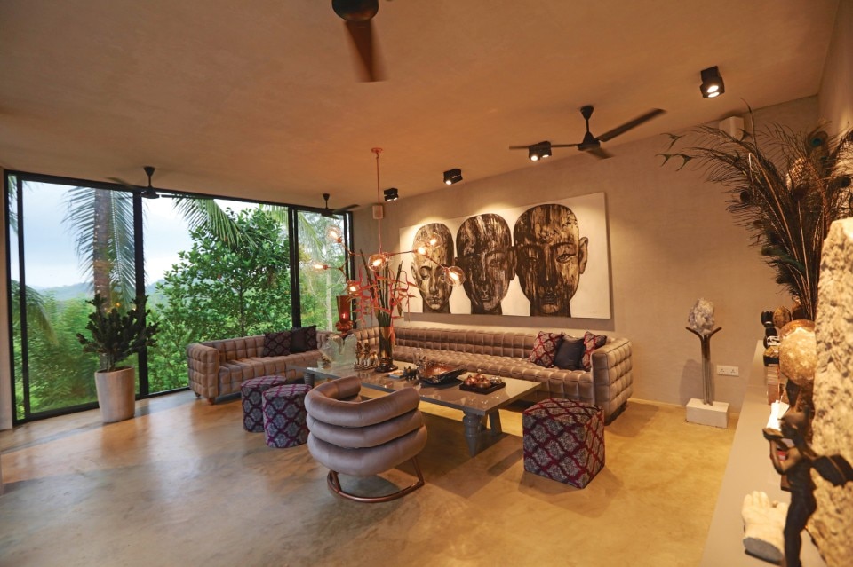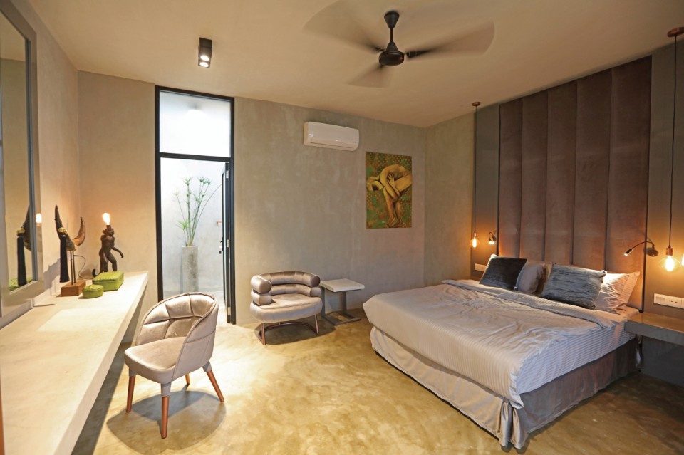 The simplicity of the architecture accentuates the beauty of the property. The structures, from the walls to the flooring, have a grey cement finish, to complement the environment as well as to ensure easy maintenance of the property. The palette is subtle with the main colours being grey, black, copper and purple. Unique interior installations including objet d’art, which have a contemporary artistic feel and distinctive aura, feature throughout the spaces of the private villa. While furniture has also been imported, the wooden cupboards in the kitchen and other rooms were designed in-house by Thomas Elbaum, Patrick Österman and Vadim Stepanoff and produced by carpenters in Moratuwa.