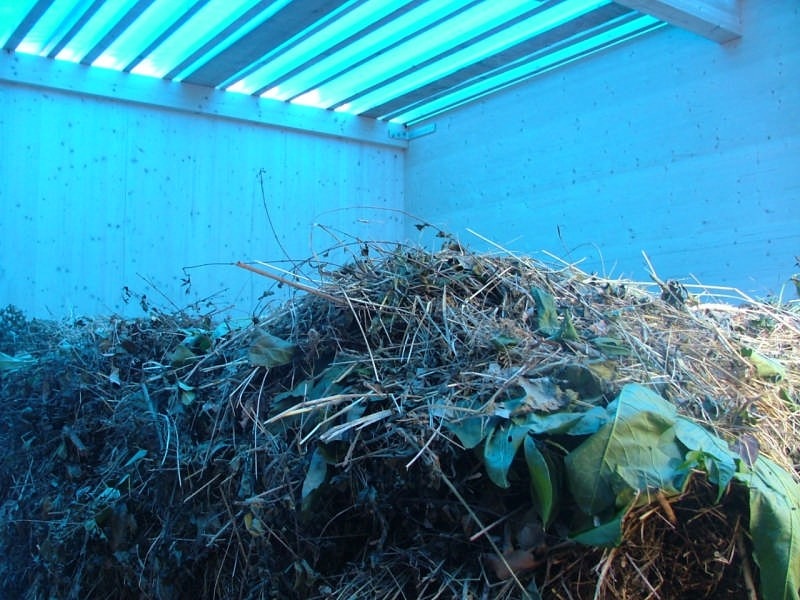 A tempietto, sited at an angle of the Austrian pavilion, hewn from coarse timber; a roof of blue plastic tarpaulin, loosely fitted; two steps leading up to an open entranceway; and inside: a huge compost heap, affording little space for visitors, who breathe in the odour of the decomposing plants and have close up view of plants slowly turning back into earth. Creation and decay, nature, culture, art, a multi-sensory preception.