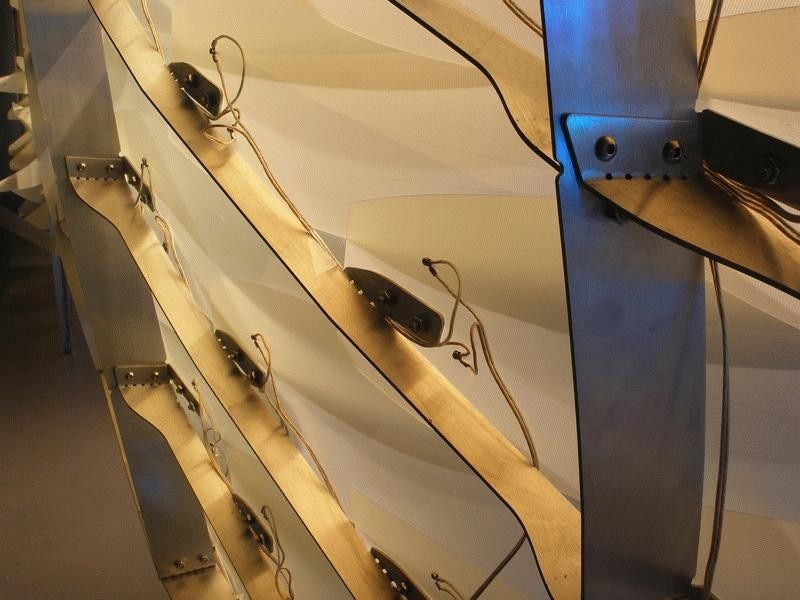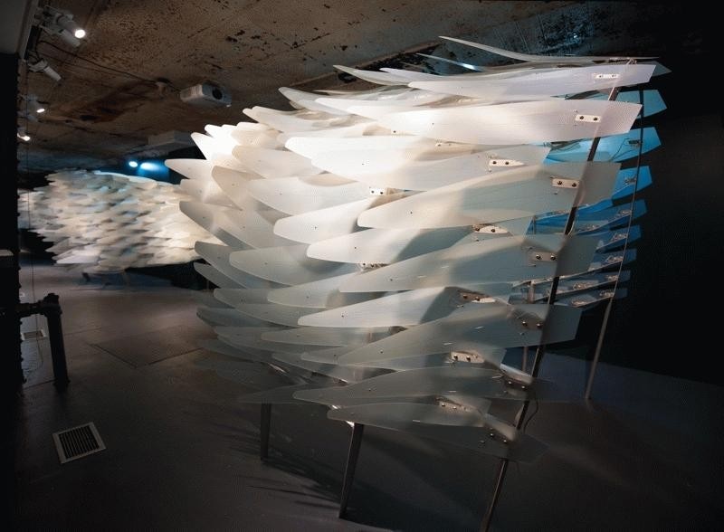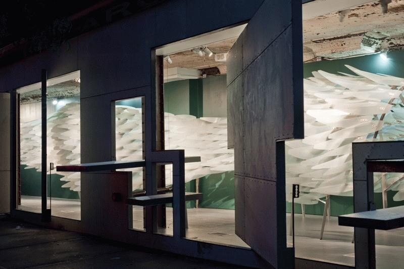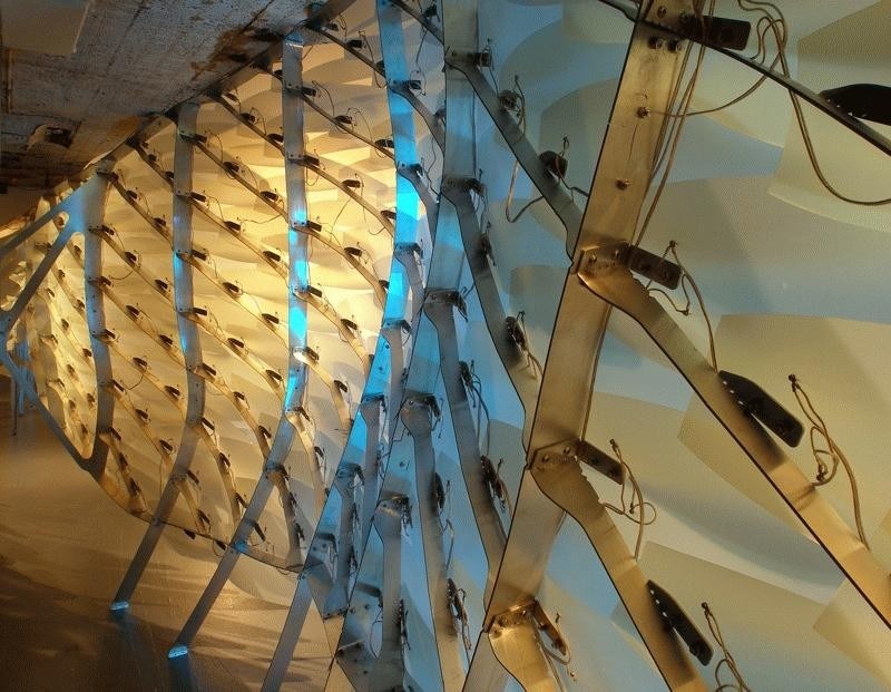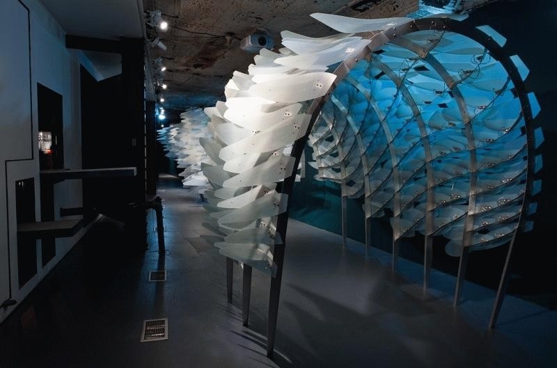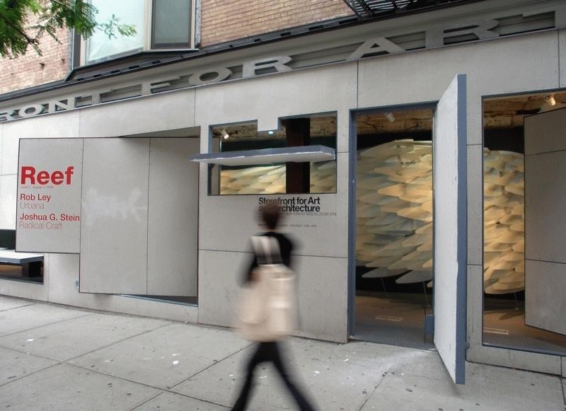 Reef investigates the role emerging material technology can play in the sensitive reprogramming of architectural and public space. Shape Memory Alloys (SMAs), a category of metals that change shape according to temperature, offer the possibility of efficient, fluid movement without the mechanized motion of earlier technologies. Operating at a molecular level, this motion parallels that of plants and lower level organisms that are considered responsive but not conscious. A field of sunflowers as they track the sun across the sky or a reef covered with sea anemones, offer images of the type of responsive motion this technology affords. Its use in practical applications has been limited to the medical and aerospace fields as well as novelty toys - the super exclusive vs. the trite. Despite the potential of this technology, there have been few serious attempts to test its possibilities at the scale of architectural environments. Reef's unique exploration of technology shifts from the biomimetic to the biokinetic while liberating and extending architecture’s capacity to produce a sense of willfulness. This installation investigates the potential for emerging material technology to shape the perception of the built environment through the activation of membrane and partition surfaces. In this installation at Storefront for Art and Architecture in New York, the public engages in the new social nuances revealed as exhibition is redefined by exploding the perceived 'wall' separating private and public space. The responsive membrane creates a diverse range of porous and dynamic enclosures capable of producing sophisticated, flexible responses to an existing program. Reef creates an interior condition which reacts according to an exterior street scape, and reasserts an active, willful role in shaping that public space. Reef furthers the experimental agenda of Storefront through the investigation of a sophisticated and flexible negotiation of the public street and the typical 1st floor retail space. The original façade installation by Acconci and Holl engaged public space in a novel way by locating the art and architecture experiment at interface between gallery and street rather than sealing it off from the public life of the street. Reef extends this experiment through the introduction of a more precise and fluid secondary interface; one charged with the purpose of fostering refined social interactions through a variable, and fluid porosity.. Unlike the typical activities that one associates with ground floor spaces of the city -- retail, office, or gallery - here the motion and sway of nature, like trees in the wind, is enfolded within interior space, drawing in the sensibility of the outdoors. In tandem with the Acconci/Hall façade, Reef questions the negotiation between the public realms of urban space and the intimacy of the interior.