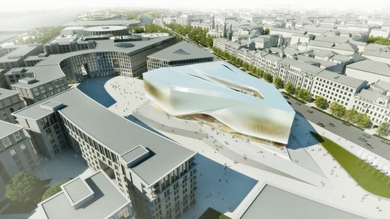 The Dance Palace forms an integrated part of the European Embankment city quarter masterplan for a new urban square in the historic centre of St. Petersburg.
