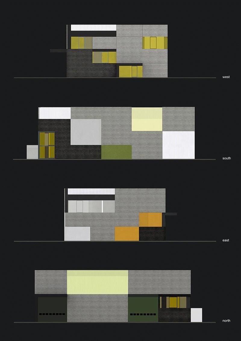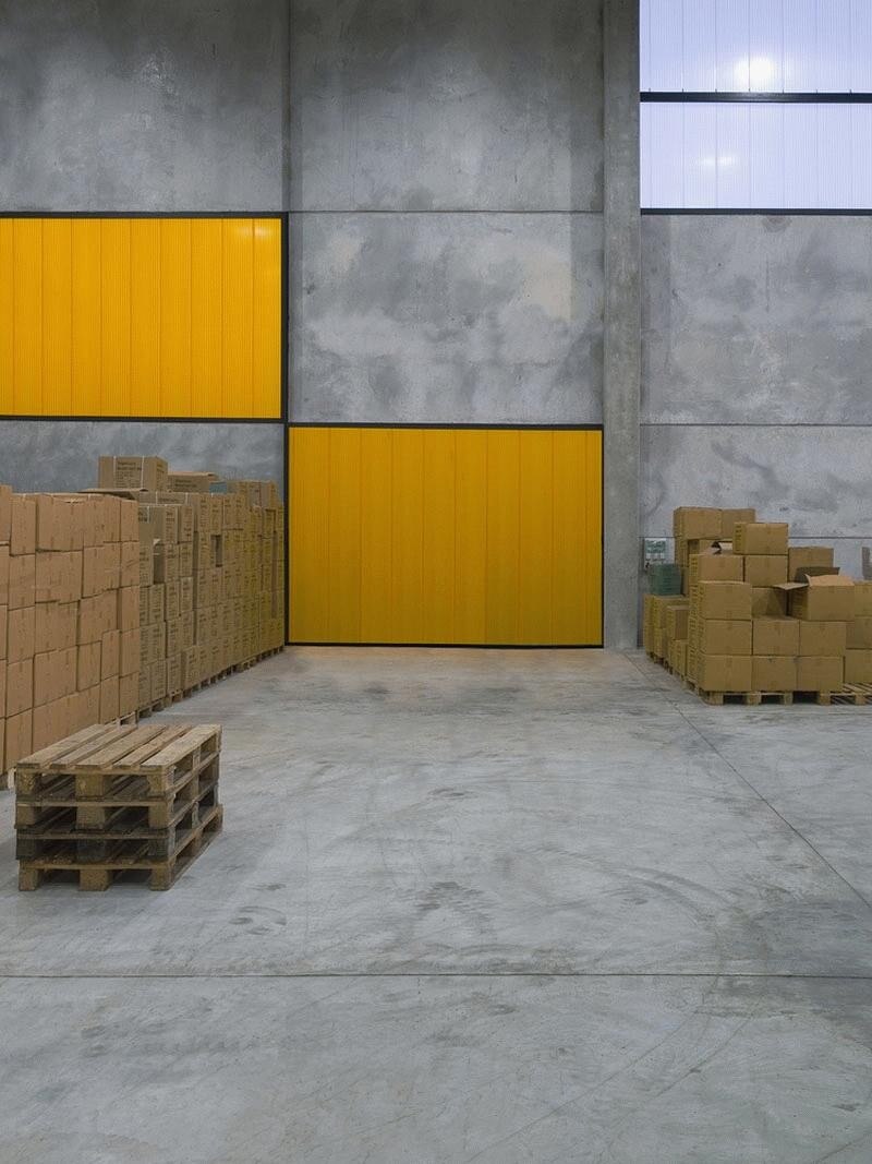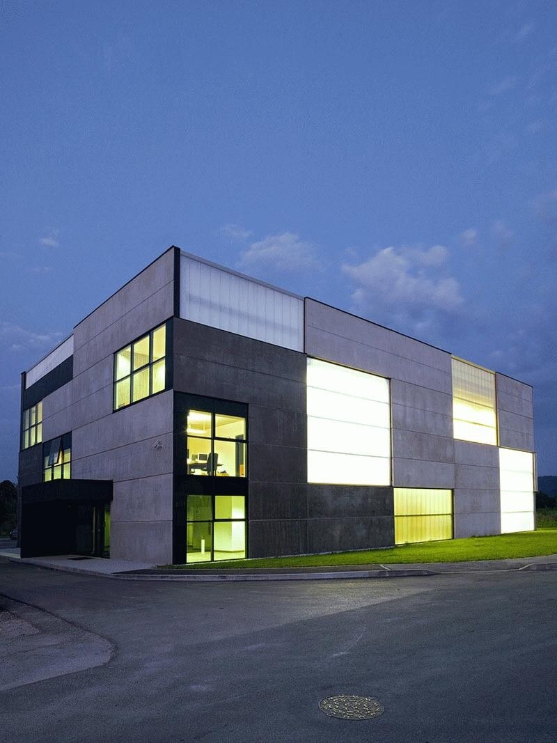 The elevation cuts break the functional facade grid and reinstate flowing concrete elements in between translucent screens. The offices have a transparent double-glazed facade, the storage spaces are with semi-translucent polycarbonate elements and two openings on the back as loading dock doors.