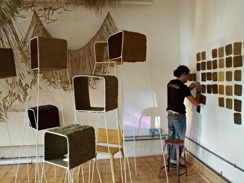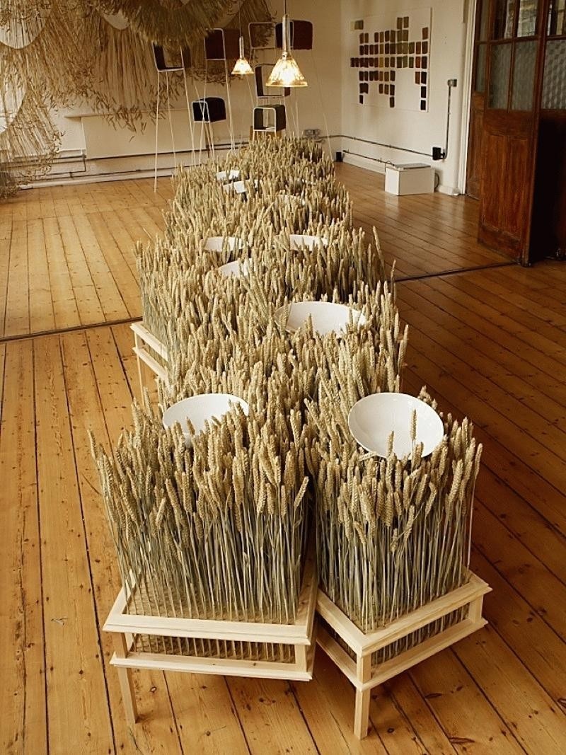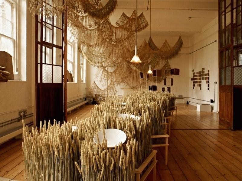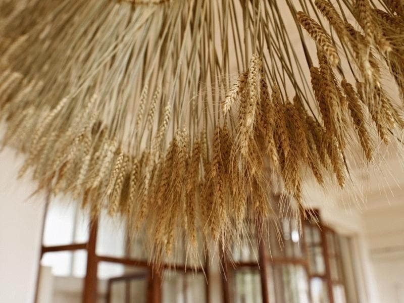 A long table by Raw-Edges Design Studio has been designed to mimic a cornfield, made of bearded wheat, oats and barley stalks, and set in old wooden display cabinets. This is showcased alongside Crop, a collection of one-off pieces by Naco Carbonell, and a site-specific installation of hanging, garland-like strands of wheat by Rowan Mersh.