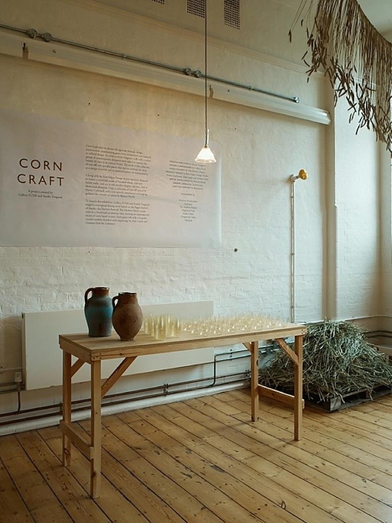 To launch the exhibition, Gallery Fumi and Studio Toogood staged a conceptual dining event based on the Pagan festival of thanks, the Harvest Festival. The Modern Pantry recast corn in a literal and an abstract way, creating an experimenatl menu of corn-based recipes served by waiters dressed in corn dolly-inspired adornments. Each guest left with a bespoke crystal and tumbler detailed with engravings by Max Lamb and Gemma Holt for Lobmeyr.