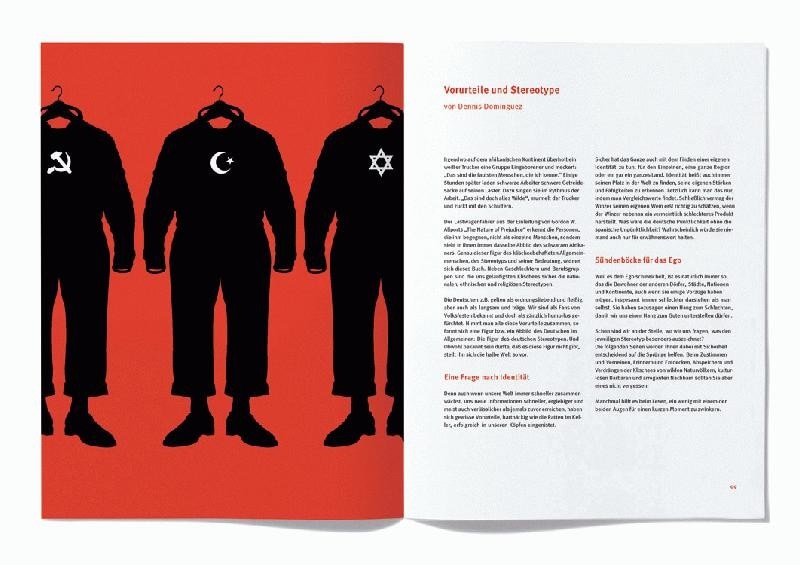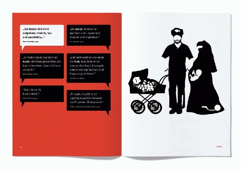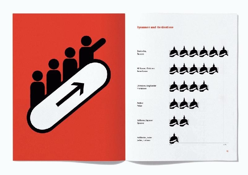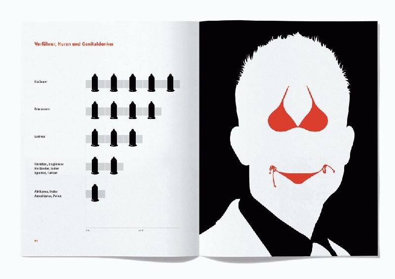 In total, eight works from different categories were nominated for the honorary title; the jury selected “Stereotype” because of its outstanding design and the topic’s original implementation. The book about prejudices and national clichés depicts the properties we attribute to certain professional groups, nations and religions in a highly bold as well as entertaining way. With a rich collection of quotes from famous politicians, writers and journalists, a total of 20 caricatures of different national stereotypes are presented. Their specific traits are exposed by the designer using stylised and minimal illustrations. In another chapter he creates rankings using icons showing objects such as knives, roosters and also condoms, ranking nations according to characteristics such as “murderers, violent and vindictive people”, “show-offs and arrogant people”, and “seducers, whores, and people thinking with their genitals”. The fact that today – exactly as we did centuries ago – we take in clichés and prejudices like a dry sponge absorbs water, and that they stick like limpets, is discovered by the reader in an amusing and impressive way.