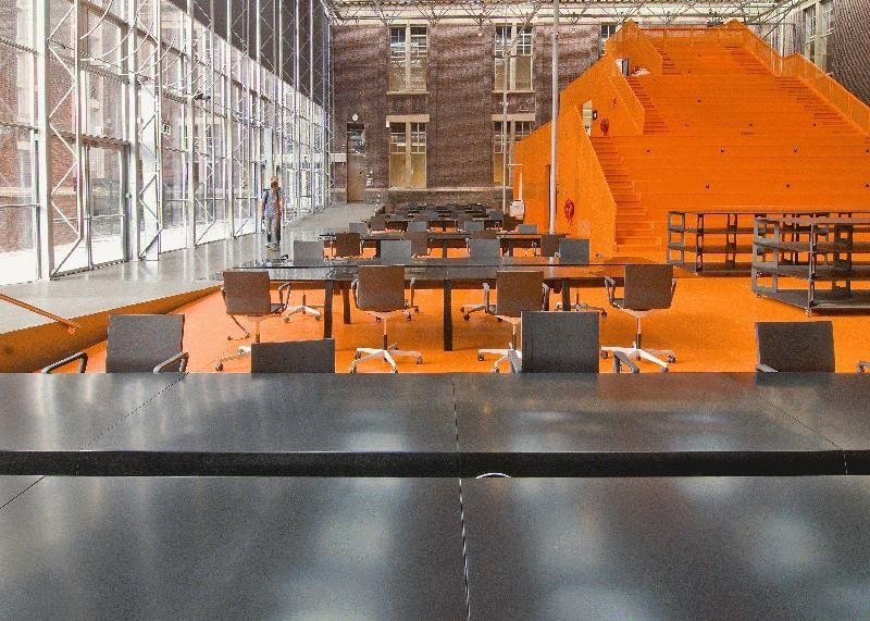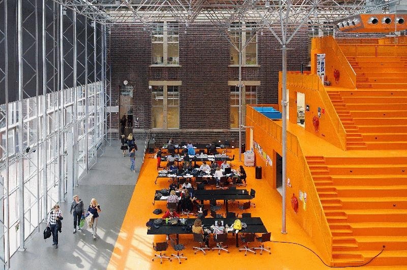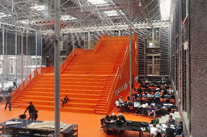 After a fire destroyed their premises, The Why Factory and the faculty of architecture of Delft University moved into the former main building of the university. An interior courtyard was created and designated as the new residence of The Why Factory. MVRDV designed the three floor tall wooden structure, containing lecture halls, meeting rooms and the premises of the research institute. An auditorium stair climbs to the top, literally putting the students on top of their teachers.