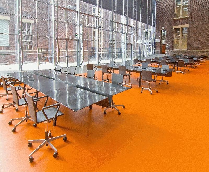 The colors of the tribune and the furniture was decided by both Richard Hutten and MVRDV. The structure distinguishes itself by its bright orange colour which clearly identifies The Why Factory as an independent research centre within the Faculty of Architecture, Delft University of Technology. Designer Richard Hutten designed flexible furniture to allow the space around the tribune to switch function between research hall, lecture hall and exhibition space.