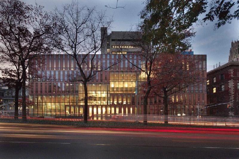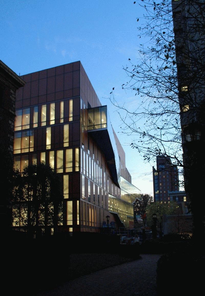 The Diana Center’s innovative wedge-shaped design frames a clear sightline from one end of the campus to the other, linking for the first time Barnard’s historic entrance gates to Milbank Hall.?The facade, composed of 1,154 clear and etched color glass panels of varying widths, translates the brick and terra cotta of the surrounding neighborhood into a luminous, energy-efficient exterior. The gradient patterns of transparency and opacity that comprise the curtain wall create constant shifts in hue and reflectivity throughout the day, giving Barnard a dynamic presence on Broadway. “The collaboration between landscape and building has been the driving force behind the design for The Diana Center,” said Marion Weiss and Michael Manfredi, principals of Weiss/Manfredi. “We envisioned the Center as an open lens that would showcase the activities and programs at Barnard and make them visible, enhancing the College’s dynamic relationship to the City.”
