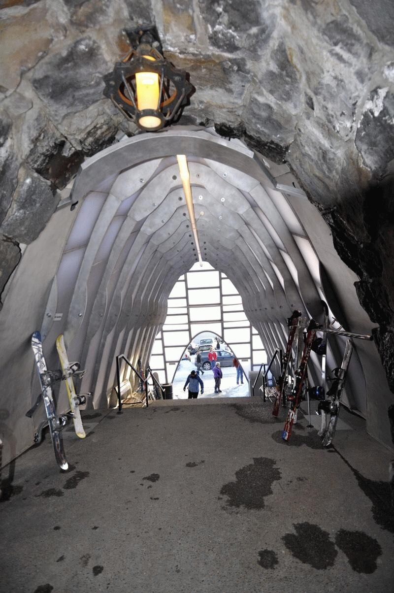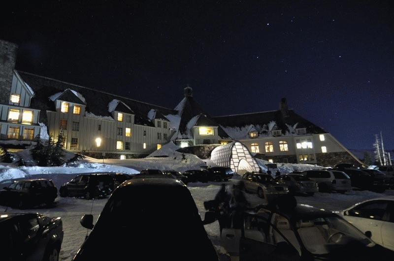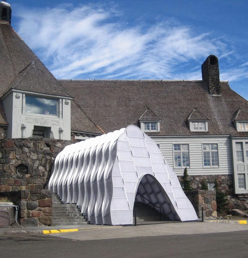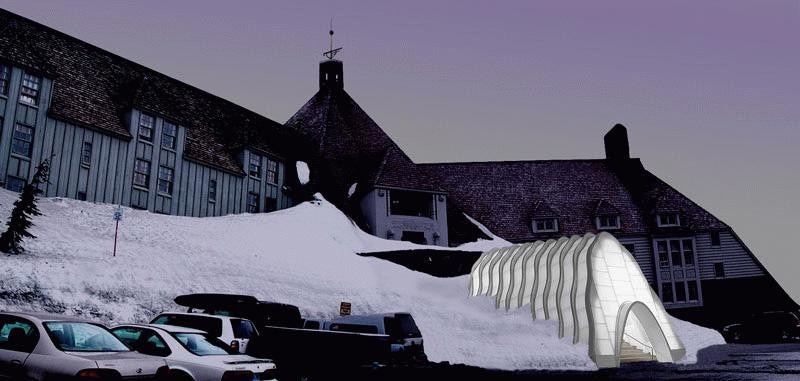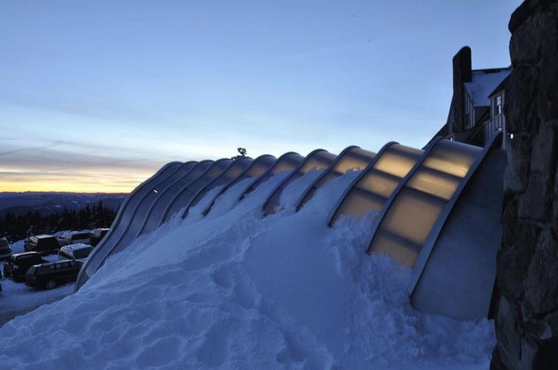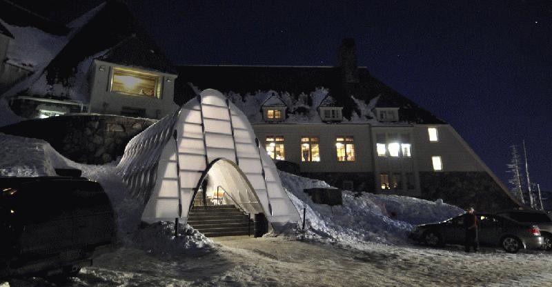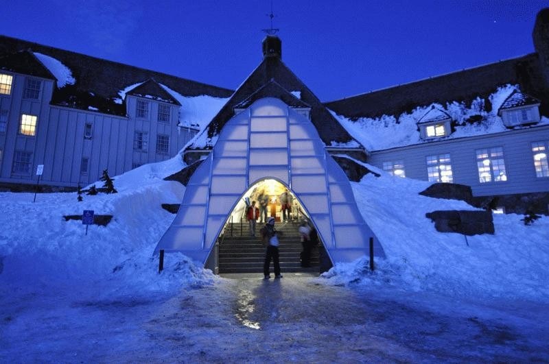 Under light powder the illuminated portal glows like a lantern. As the winter snows accumulate the lantern morphs into a snug contemporary igloo, able to withstand the formidable snow and wind loads encountered on Mount Hood.