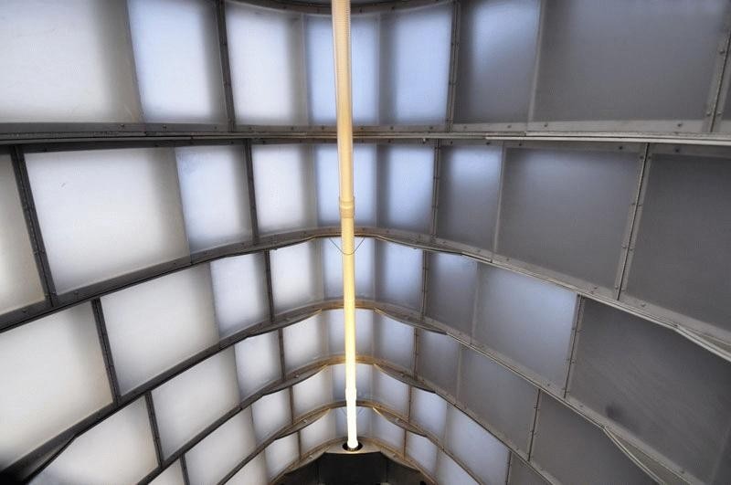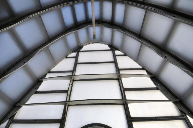The entry is formed from a series of parabolic arches, with profiles waterjet-cut from half-inch-thick aluminum plate. Each profile is interlaced with continuously welded ribs supporting a double skin of translucent polycarbonate panels which are lightweight, durable and replaceable.