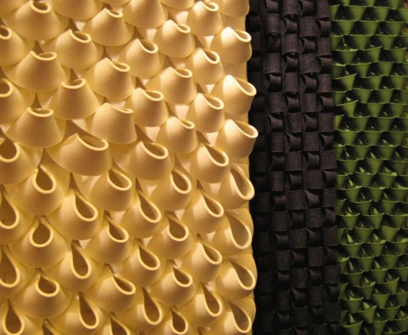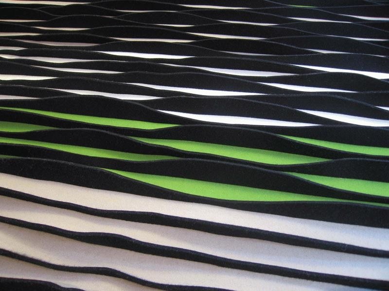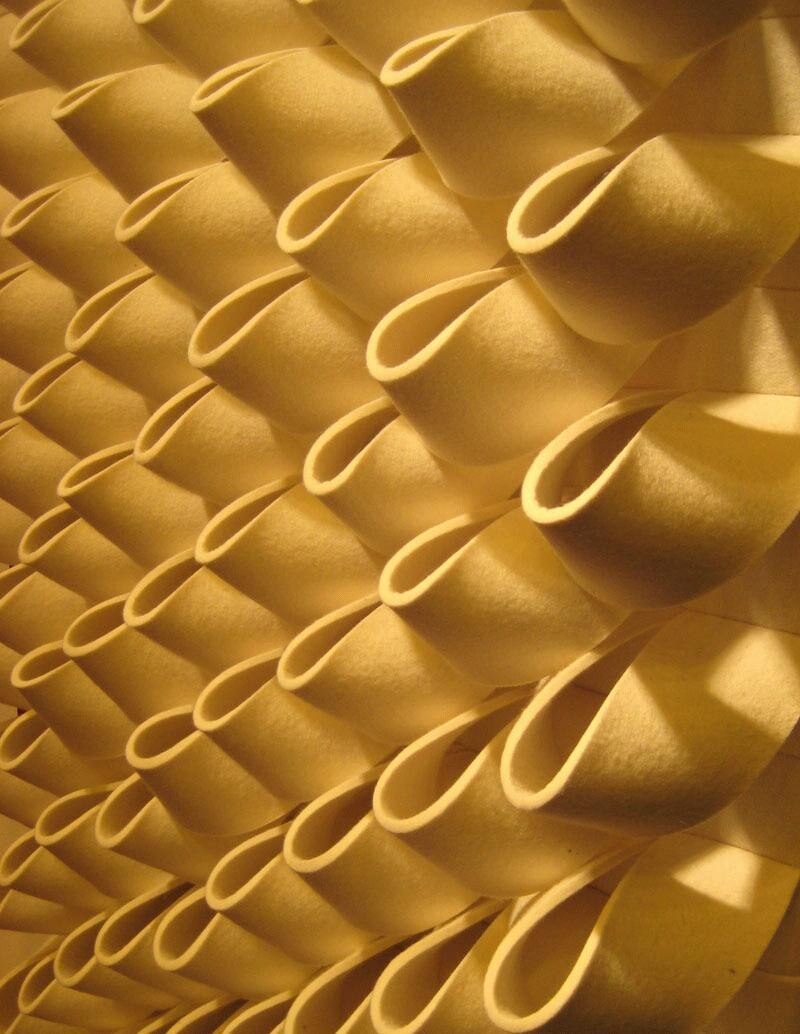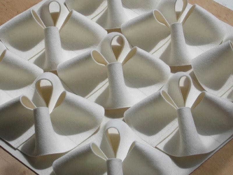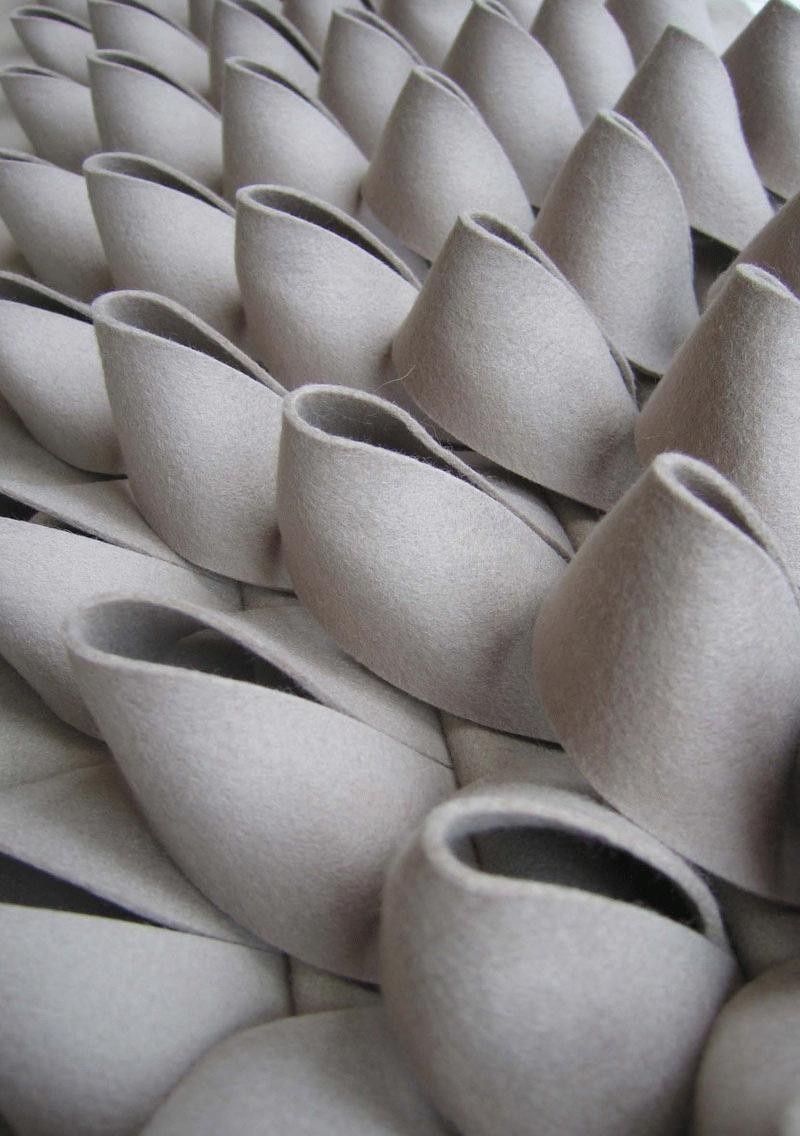 Anne Kyyrö Quinn designs highly decorative acoustic wall panels which are constructed using industrial felt. Her three-dimensional, sculptural creations bring dramatic, architectural elements to both public and private spaces. In terms of appearance, they are more reminiscent of works of art than traditional textiles. The panels are custom made to order and cut, sewn and finished by hand to a very high standard at Anne Kyyrö Quinn’s London studio.The designer, who is inspired by the interplay of light and shade on the surface of her textured felt textiles, creates dynamic optical illusions as the surface structure appears to change depending on the way it has been lit as well as ones viewpoint.