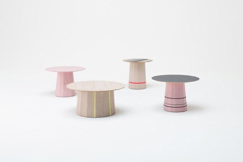 The side tables vary in size, colour and pattern. The objects are the result of considerations based on the characteristics of thinned wood as well as woodworking traditions. Small diameter wood is joined to form a volume. The symbolic layers of a contemporary view on traditional shapes and techniques are achieved by superimposing different layers of colour shades and patterns. The texture of the wood is overlayed with translucent colour, which in turn is overlayed with a printed graphic pattern. The layers balance each other out and create depth in the stained and printed oak.