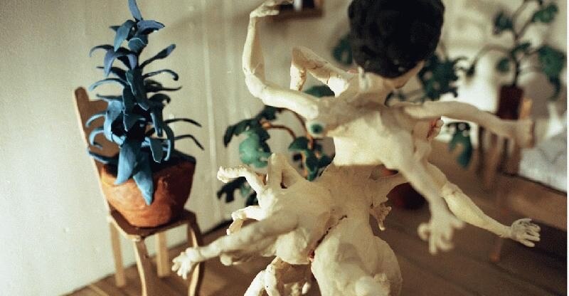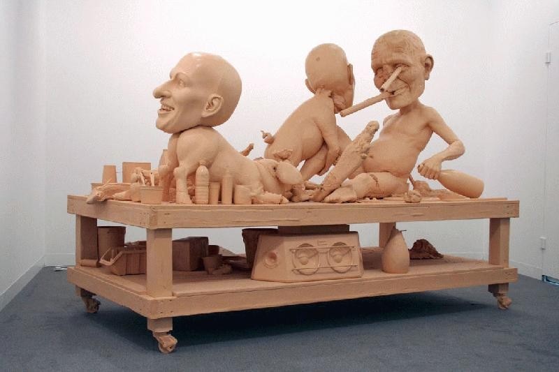 Images, from top to bottom: Nathalie Djurberg, It's the Mother, 2008, video with music by Hans Berg, 6 min; Jeff Koons, One Ball Total Equilibrium Tank, 1985, Glass, iron, water, and basketball; Janine Antoni, Saddle, 2000, full rawhide; Robert Gober, Untitled, 2009, beeswax, cotton, leather; Paul McCarthy, Paula Jones, 2007, fiberglass; Tim & Sue Noble & Webster, Masters of the Universe, 1998-2000, translucent resin, fiberglass, plastic, and human hair; Roberto Cuoghi, Pazuzu, 2008, epoxy, solvent varnish, fiberglass, polystyrene, and steel; Andro Wekua, Sneakers 1, 2008, wax figure, aluminum casted table and palett, akrystal board, and ceramic shoes; Jannis Varelas, My dad is stronger than yours, Rainbow Rocket Bill and Friend, 2005, pencil, charcoal, oil, glitter, and collage on paper; Charles Ray, Aluminum Girl, 2003, aluminum and paint.
