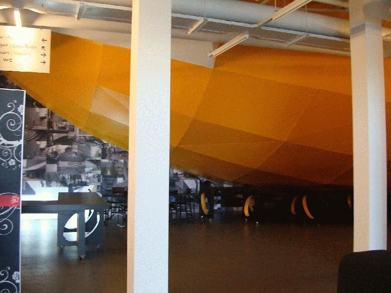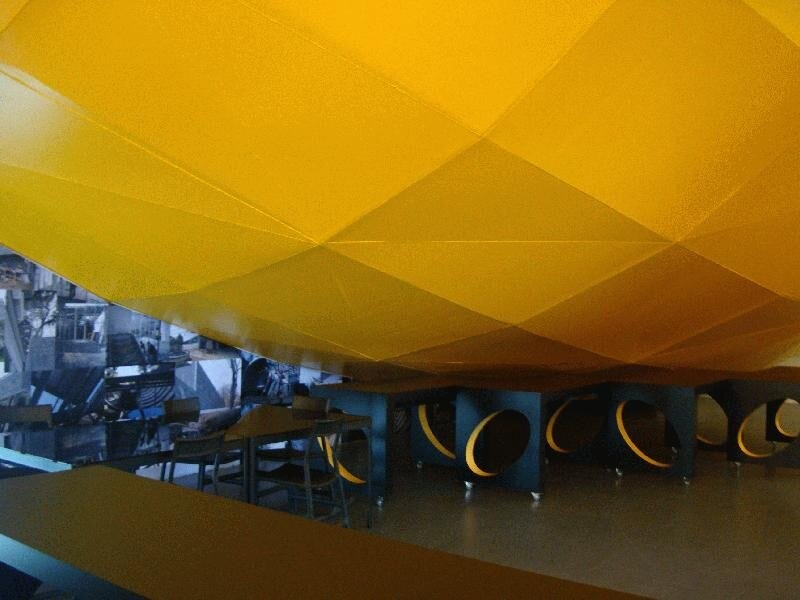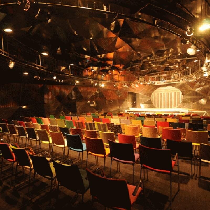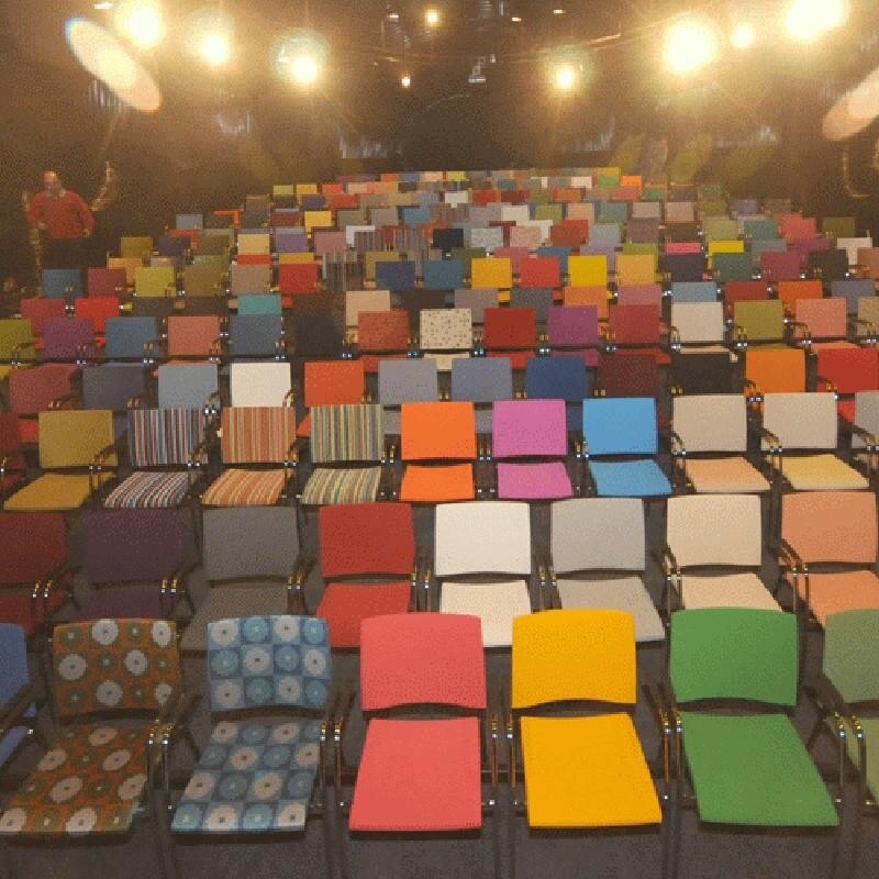 When you enter into the building you find the yellow ‘seed’ in front of you in the foyer. Inside the yellow ‘seed’ you find a black shell which has been constructed with acoustic panells, the sliding pavement and the sliding stage for different uses. Before the music begins you must choose a color between 300 seats in different colors...