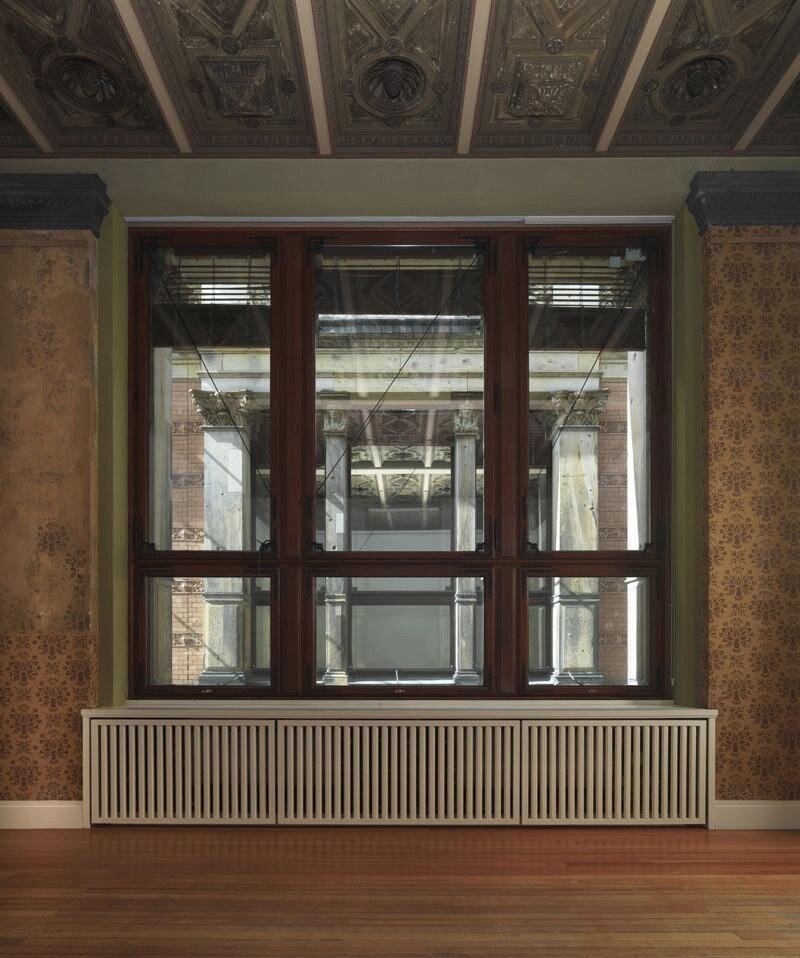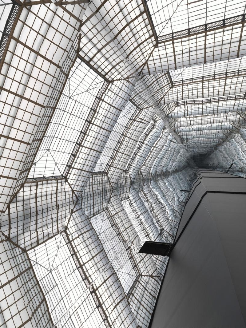 Eliasson’s capacity to double, extend, and turn inside out is nowhere more visible than at the heart of the Gropius-Bau. He eclipses the ornaments of the interior facade by installing a gargantuan kaleidoscope, reaching to the skylight, that catapults the viewer into a perplexing architecture of infinite reflections. With simple means, the artist stages the visible illusion of a crystal palace where the visitors, enveloped in this porous architecture, are suspended between inside and outside”.
