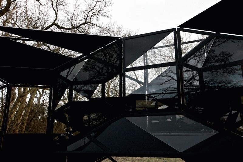 The blind pavilion consists of a double-layered steel construction clad in a series of transparent and translucent polygonal glass segments. Visitors can walk between the glazed layers that at some times reflect and some times obscure the surrounding area. The pavilion’s structure follows a central perspective geometry. The panes of glass are arranged in such a way that the viewer is surrounded with a completely black panorama when standing in the pavilion’s centre – an illusion which collapses when he or she moves a step to the left or right. The visitor’s movements expose the “perfectly blinded view” as a mere construction and at the same time presents the island’s unique surroundings in an entirely new light.
