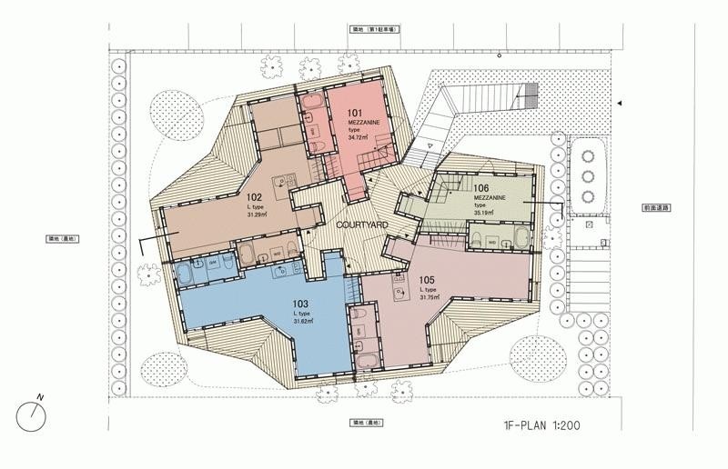 There are six “L-Shaped” units that form the petals of the flower, and provide the building with its basic massing. In addition, there are two three-story mezzanine units on the north side of the building whose additional floor provides the required sunlight. Each unit is approximately 30 sqm.