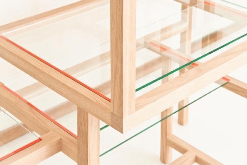 KamerRekwisiet is a partition made of plain oak with coloured areas of different kinds of thread. As a three-dimensional painting it gives the space atmosphere and warmth. Wilcke’s 4D Cabinet, inspired by KamerRekwisiet, is the next step in the development of this concept. The open structure of the cabinet is subordinate to its content. It is like a blank canvas on which the user ‘paints’ a story, by placing the objects in the cabinet.