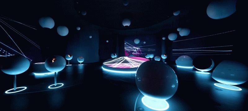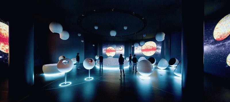 In the "Globe of Science and Innovation" visitors are given an understanding of this complex scientific field. Below the 27 metre high dome of the wooden pavilion spherical kiosks and display cases combine to give a content-generated room narrative. They provide a wealth of information and opportunities for interaction, arranged according to target groups and subject-matter. The highlight of this free-flow exhibition is a dynamic spatial experience that has been staged with multimedia allowing visitors to experience the Big Bang as a phenomenon. The exhibition space itself, covering 450 square metres, becomes an exhibit using film, sound and light choreography.