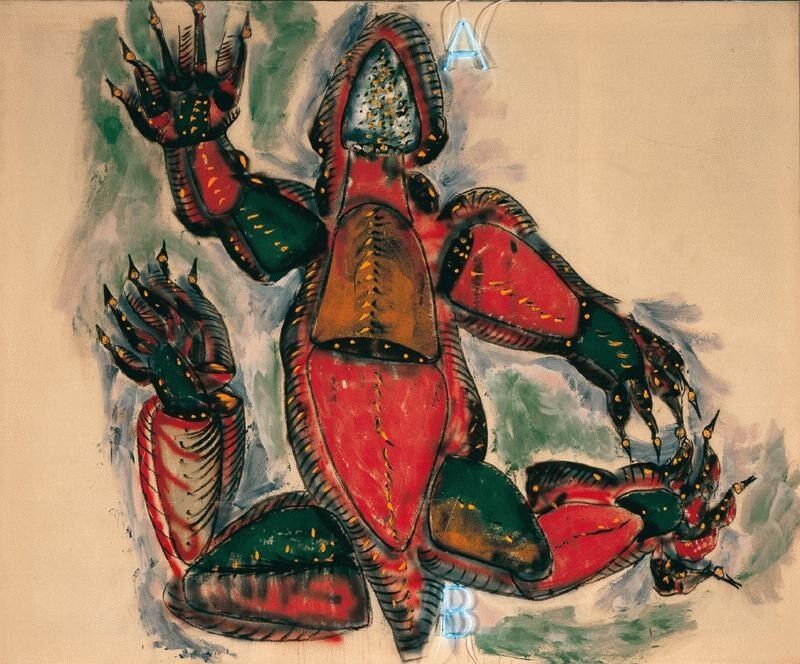 Rudi Fuchs continues: "Once I saw Mario Merz make some of the large, loose paintings which are now on show in this exhibition. He used a wet brush and cans of spray-paint on unstretched canvas, thin and light as bed-sheets. It was more drawing than painting: long extended curving and crawling lines, making figures of a kind (mostly fantastic animals). The shapes were distinct, powerful in colour and outline. They were heraldic."