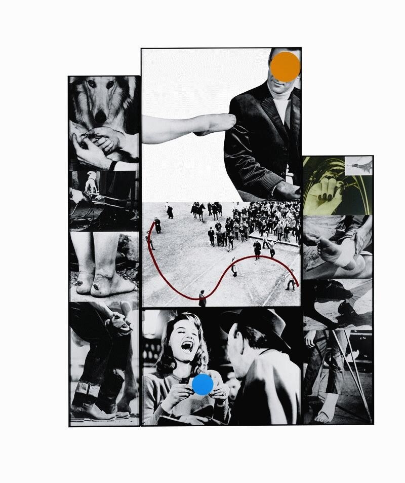 Beginning in the early 1980s, cinematic references become even more apparent with the artist’s use of found film stills that he cropped and enlarged to create photocompositions. Abandoning the standard rectangular canvas or photographic format, Baldessari constructs irregularly shaped compositions from film stills, creating provocative juxtapositions. According to the artist: “I think of the images that I use as units, like words might be units, and I construct similarly to a good poet, where I’m trying to get a certain kind of syntax, a certain explosion, a meaning when these units collage, building up an architecture of meaning, so to speak.”