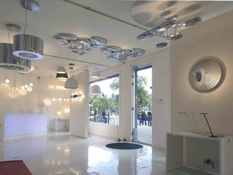 Lo showroom, situato in Hobbemakade 89, è collocato in una posizione centrale e strategica della città, in un edificio storico. Lo spazio espositivo si estende su un unico livello, una superficie complessiva di 180mq, e offre la massima visibilità dei prodotti e delle differenti performance luminose. Si tratta di uno spazio apparentemente rigido e geometrico che, ritmato da vetrate, mostra all’interno una configurazione versatile in evoluzione dinamica, progettata per scenari aperti e interpretabili, grazie alla totale integrazione della tecnologia in un’architettura che vuole mettere in scena il design. Sfondo per questo intento è una “pelle” interna completamente bianca che, come la tela di un pittore, rappresenta il supporto neutro per dare vita al racconto della luce.