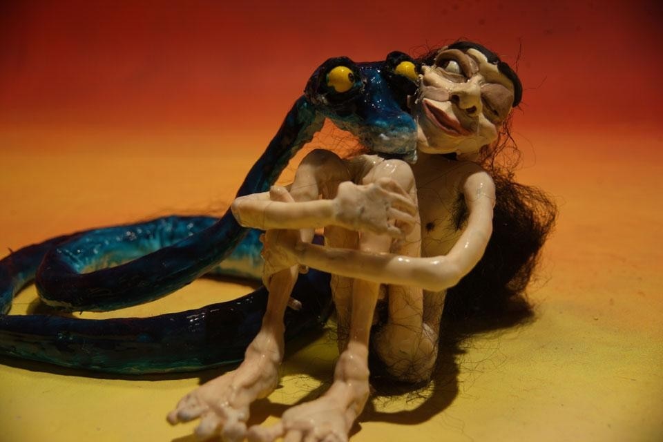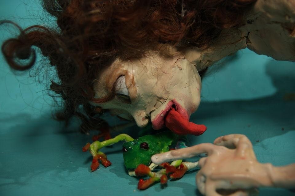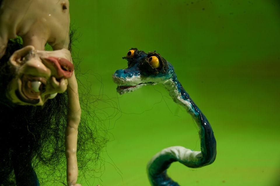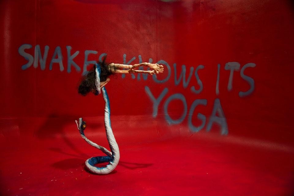 The Swedish artist Nathalie Djurberg (b. 1978) is best known for her animated films. These may seem sweet and innocuous on first acquaintance, but in her work Djurberg addresses themes such as obsession, power, pleasure, desire and violence. In her films she creates animated, surrealistic 'fables'. Her world involves clichéd fairytales that derail into a battleground filled with death, sex and violence. In 'Snakes knows it's Yoga', Djurberg explores the fear of death. In one of the films a naked young woman plays the lead role, going on an ecstatic dance with a colourful frog. She tries to lick the poisonous frog in order to reach higher spheres, like a shamanistic ritual. In another film a snake hypnotises a skinny man who is meditating, eventually overpowers this yogi and tears him apart.
