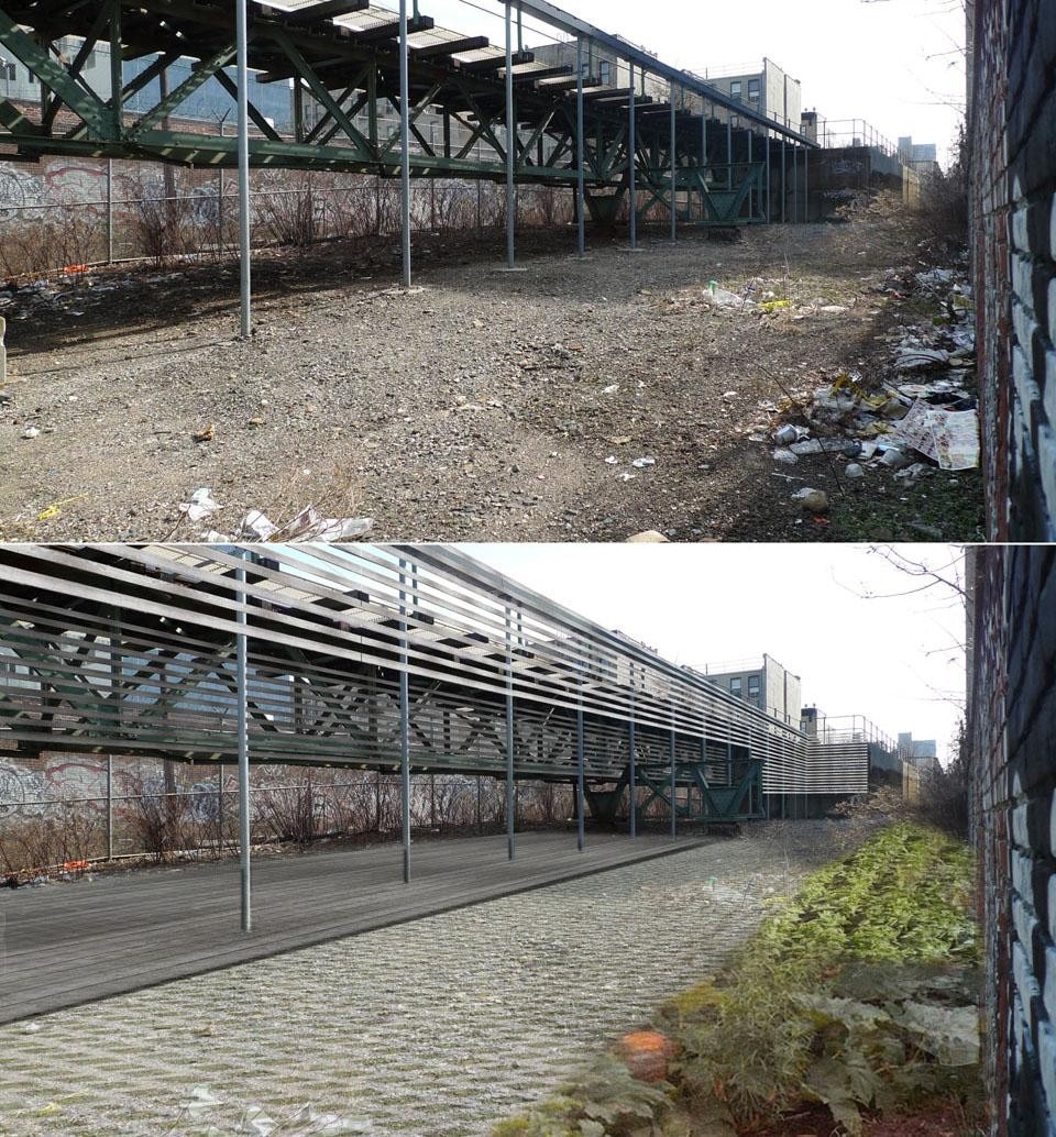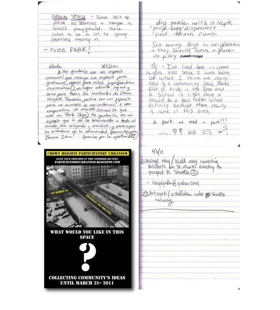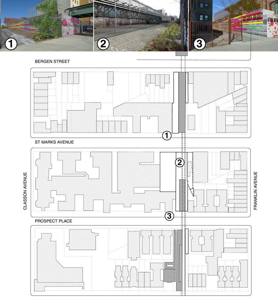 The Crown Heights Participatory Urbanism project takes a landscape urbanism approach to rethink residual spaces adjacent spaces to the Franklin Avenue shuttle train towards a new public space network. The project is founded on the idea of creating a common ground for residents, business owners, governmental entities and local community organizations for more plural public spaces in the context of a diverse emergent community in the Crown Hill/Crown Heights neighborhood.